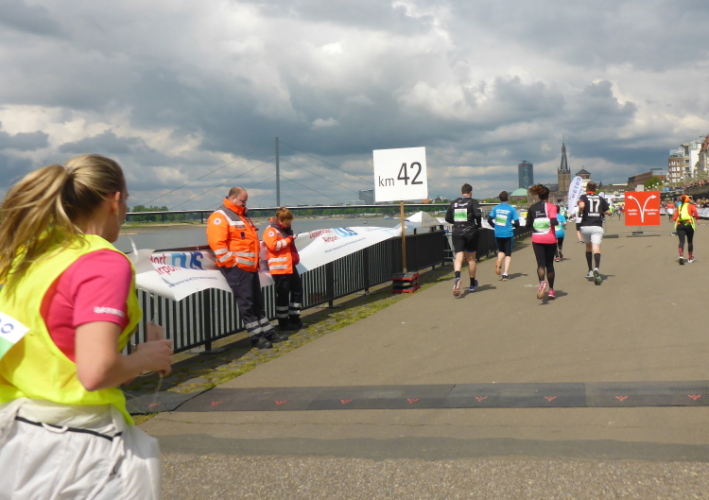 Lückenlos stehen jetzt Zuschauer, die zum Endspurt motivieren, die Trommler sind fast auf Tuchfühlung. Endlich können wir unter uns den Rhein erblicken. Dann die Zielgerade. Ich bin erschöpft, die Zuschauer befinden sich zunächst mehrere Meter oberhalb auf der Promenade und sind begeistert, aber leider kaum zu hören. Gut, dass ich nicht alleine bin. Km 42, die Strecke geht plötzlich auf, das Ziel liegt vor mir. Jetzt sind auch direkt an der Strecke hinter Absperrgittern lärmende Zuschauer und das mehrreihig. Wie in einem Stadion werden wir bejubelt und beglückwünscht. Der Sprecher kündigt mich sogar persönlich an.