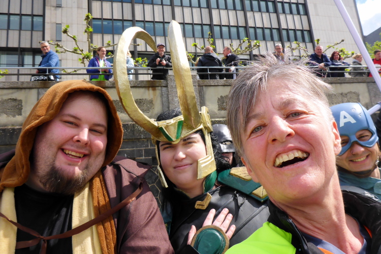 Vor uns taucht nun, sich immer wieder hinter Häuser versteckend, der 240 m hohe Fernsehturm auf. In einer kleinen Grünanlage ist das K21, die Kunstsammlung NRW, zu sehen. Wir werden aber abgelenkt durch Zuschauer, die hier unter der Brücke mit genialer Akustik eine überdimensionale Musikanlage aufgebaut haben und das ganze Areal mit Rockmusik beschallen. Drei Jungs bieten auf einem Tischchen Getränke an. Ich greife zu. „Glückwunsch, Du bist die erste Frau, die einen ganzen Becher Bier schafft!“