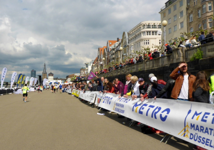 In Oberkassel ist einiges los. Auf der weiten Luegallee geht es nachher wieder zurück. Die vielen Zuschauer abwechselnd die langsamen und die schnellen Läufer anzufeuern. Bei km 15 gibt es Getränke und Bananen. Jetzt geht es in die Hansa Allee.