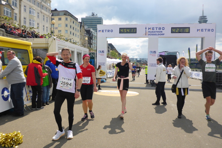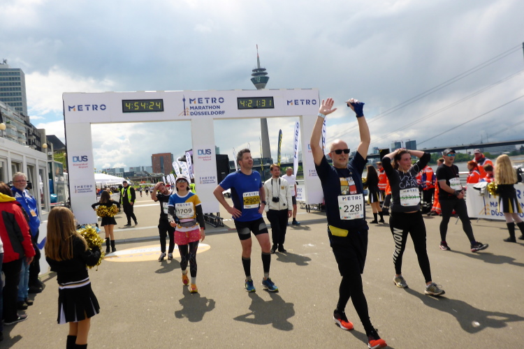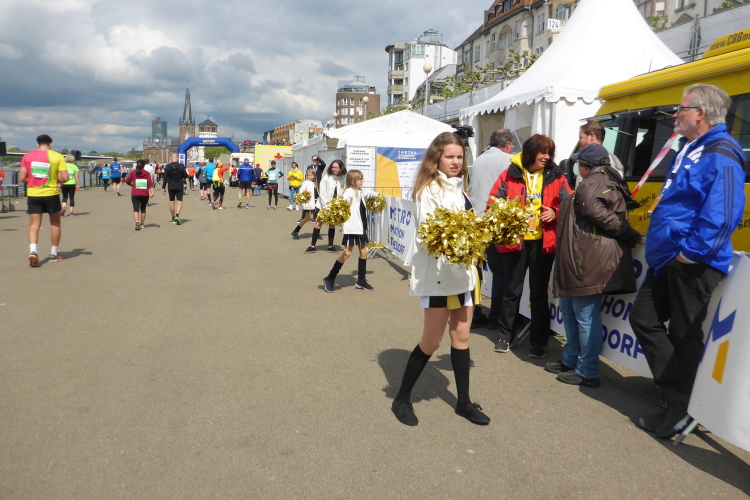 Es gibt ein Zieltor für die Staffeln und ein separates für den Marathon. Ich hab es geschafft. Zwischen den Chearleadern erwarten uns Helfer mit Wasser. Hinter mir erreicht Roman, ein Läufer mit goldener Startnummer das Ziel. Er hat den Düsseldorf Marathon mindestens zum 10. Mal gefinisht. Glückwunsch.