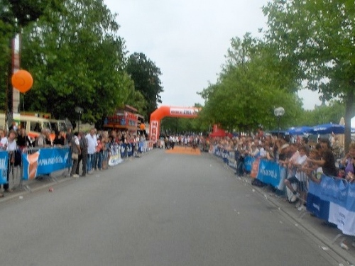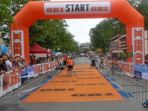 Durch ein Spalier von frenetisch anfeuernden Zuschauern wurde ich auf einer Woge der Begeisterung förmlich ins Ziel getragen. Hier erhielt ich von einer freundlichen Helferin meine Medaille umgehängt und begab mich nach der Zielverpflegung mit alkoholfreiem Weißbier zum Parc Fermé, um meine Sporttasche abzuholen und den Chip abzugeben. Ein Shuttle-Bus brachte die Läufer zu einer Sporthalle zum Duschen. Leider gab es nur noch die Wahl zwischen kaltem und ganz kaltem Wasser.
