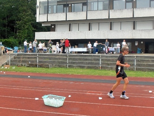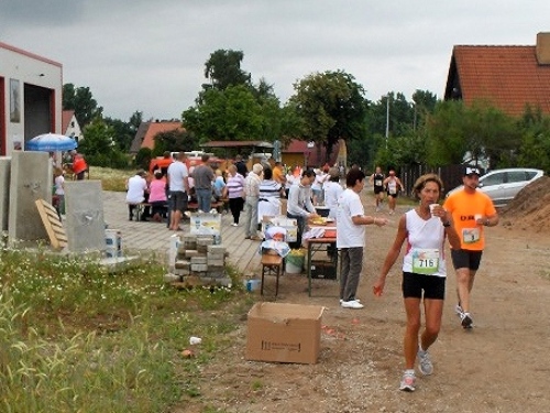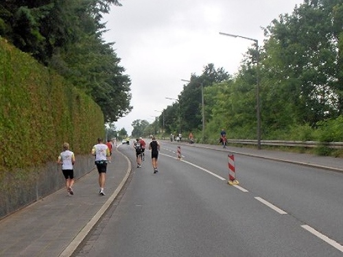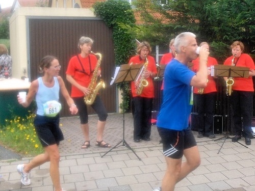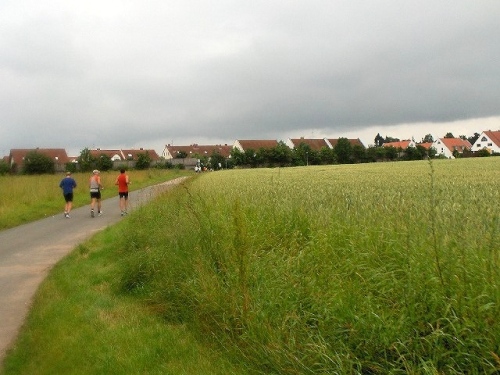 Nach diesem herzlichen Empfang fielen die folgenden Meter wieder leichter und nach einer abermaligen Überquerung der Autobahn liefen wir in den Stadtteil Stadeln. Bei Kilometer 14 war hier der erste Wechselpunkt für die Staffeln.