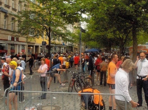 Die Nachwuchsabteilung der Cheerleader motivierte uns noch mal für die letzten drei Kilometer. Ich lichtete gerade diese Gruppe ab, als die Zugläufer für die Zielzeit von 4:15 Stunden passierten. Nanu, ging meine Uhr falsch? Nach meinen Berechnungen während des Laufes hätte ich denen doch etwa zwei Minuten voraus sein müssen. Also schnell noch ein paar Bilder vom Eisenkopf geschossen und hinterher. Langsamer als diese Jungs wollte ich eigentlich nicht sein.