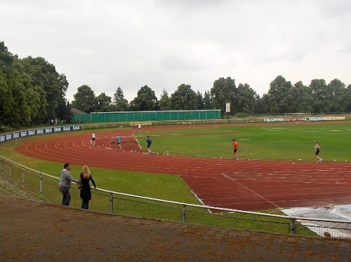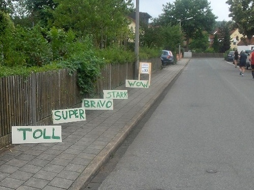 Schließlich liefen wir in das Stadion des TV1860 Fürth ein und absolvierten eine dreiviertel Stadionrunde und verließen die Sportstätte wieder durch den Hinterausgang. Die Schilder „Toll“, „Super“, „Bravo“, „Stark“ und „Wow“ taten bei Kilometer 33 richtig gut und ließen die restlichen neun Kilometer leichter laufen.