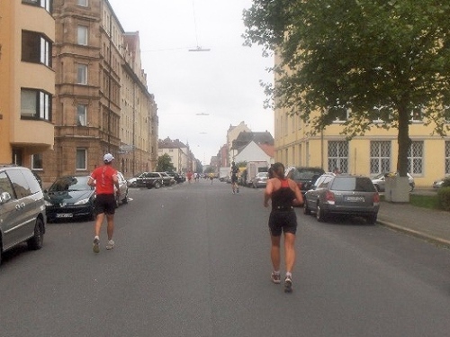 Wir kamen nun in die Altstadt von Fürth und hatten es mit Kopfsteinpflaster als Untergrund zu tun. Den Zugläufern, die sich zunächst zu entfernen drohten, kam ich wieder näher. Nach einem kurzen Plausch mit den beiden stellte sich heraus, dass sie zunächst tatsächlich etwas flott unterwegs waren, nun aber das Tempo gedrosselt hatten, um in der Zielzeit anzukommen. Ich also wieder vorbei an den beiden und ab Richtung Ziel.
