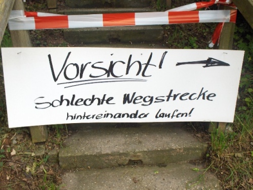 Wir unterquerten den Main-Donau-Kanal und kamen nach Atzenhof. Dort gab es an der Verpflegungsstelle vor dem Feuerwehrmagazin wieder ein kleines Straßenfest. Danach wechselte der Untergrund und wir befanden uns für die nächsten Meter auf einem holprigen Single-Trail. Ein Warnschild hieß uns vorsichtig und hintereinander zu laufen.