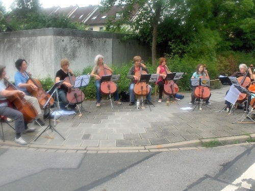Am Daimler-Werk vorbei ging es diesmal über den Main-Donau-Kanal. Nach einem kurzen Abstecher in den Ortsteil Unterfarrnbach liefen wir kurz darauf wieder über den Kanal, der Main und Donau verbindet, und betraten den Ortsteil Burgfarrnbach. An der Verpflegungsstelle, mittlerweile waren 25 Kilometer absolviert, spielte ein Cello-Ensemble für uns.