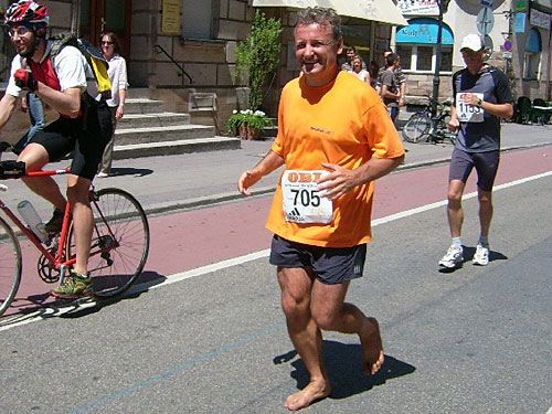 Wir stellen uns auf. Da läuft mir der Klaus Wunderlich über den Weg. Für ihn ist es ein Heimspiel, doch er hat ein Handicap, da er am Vorabend noch bei den Nachmeldungen dick im Geschäft war. Rund 1000 Sportler wollten noch teilnehmen, so dauerte sein Arbeitseinsatz bis spät in die Nacht. Der Erwin Bittel taucht auf: „Teil Dir Deine Kraft gut ein, denn die Strecke ist schwer,“ rät er mir. Der Olaf Schmalfuß hat sich heute was ganz besonderes vorgenommen, denn er will mit schmalem Fuß barfuss den langen Kanten laufen. „Viel Spaß“, sage ich süffisant zu ihm.