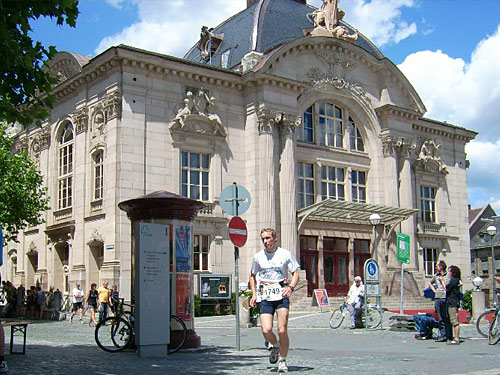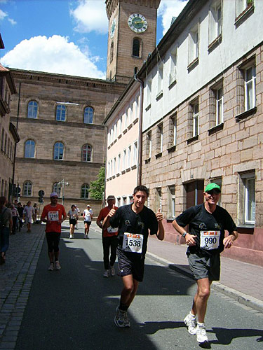 Nochmals durch eine Flussaue. Mittlerweile sehe ich Schilder des Halbmarathons und des 10-Kilometer-Rennes. Bei Kilometer 40 nähert sich unser Weg wieder der Altstadt. Auf den letzten Metern bietet die Strecke etwas fürs Auge. Wir laufen durch die Fußgängerzone zum Fürther Rathaus. Beim Anblick denkt man, man sei in Florenz vor dem Palazzo Vecchio. Zwischen 1840 und 1850 wurde das Rathaus nach Plänen von Georg Friedrich Christian Bürklein erbaut.