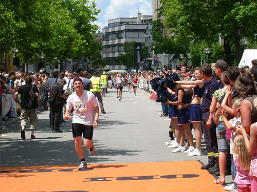 Nach zwei, drei weiteren Richtungswechseln bin ich auf der Zielgerade und laufe unter lautem Geschrei der Zuschauer durch das Zieltor. Allmächdd, des war hart, jou werkli.