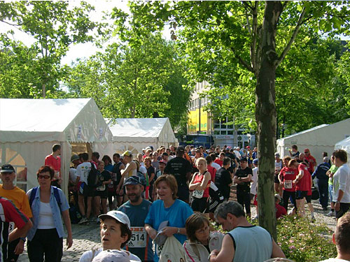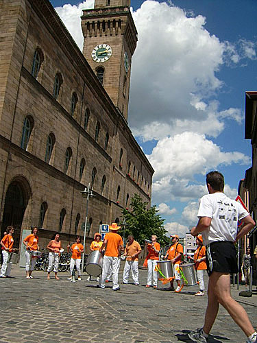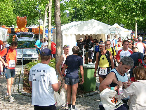 Einen Parkplatz für mein Fahrzeug finde ich ohne Probleme am Bahnhof. Nach wenigen Minuten erreiche ich die Fürther Freiheit, wo die Marathoninfrastruktur untergebracht ist. Meine sehr zeitige Voranmeldung schlägt mit 19,90 EUR zu Buche, ausgesprochen preisgünstig. Ein Funktionsshirt kann für 12 EUR auch noch erworben werden. Für die Meldegebühr erhalten wir nicht nur ein einzigartiges Lauferlebnis, sondern sie beinhaltet auch noch eine Medaille sowie eine Urkunde aus dem Internet. Am Vortag kann sich noch jeder den Bauch mit Nudeln voll hauen, auf die Welcome-Party mit Livemusik gehen, ein Beach-Volleyballturnier beobachten oder den großen Umzug der Vereine durch die Innenstadt besuchen.