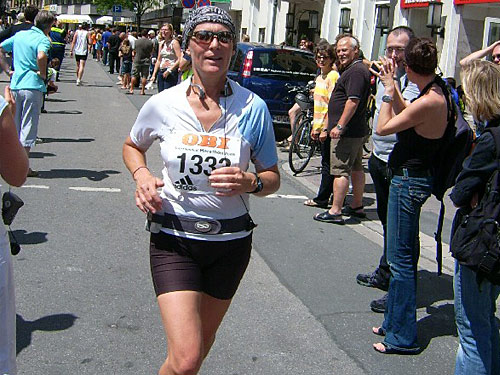 Die Wende im Stadtwald kommt. Ich bemerke, dass die führenden drei, vier Damen einen Kampf um den Sieg ausfechten werden, denn sie liegen alle in Sichtweite auseinander. Dambach ist der nächste Stadtteil. An einer V-Stelle greife ich mir ein Stück leckere Melone, die ich jedoch nur mit Gewalt hinunterwürge. Immer wieder schütte ich mir Wasser über den Kopf. Die führenden Damen haben mich überholt und sind schon auf und davon. Heinz spricht mich pausenlos an und motiviert. Er fährt sehr umsichtig und findet auch immer wieder Bekannte an der Strecke.