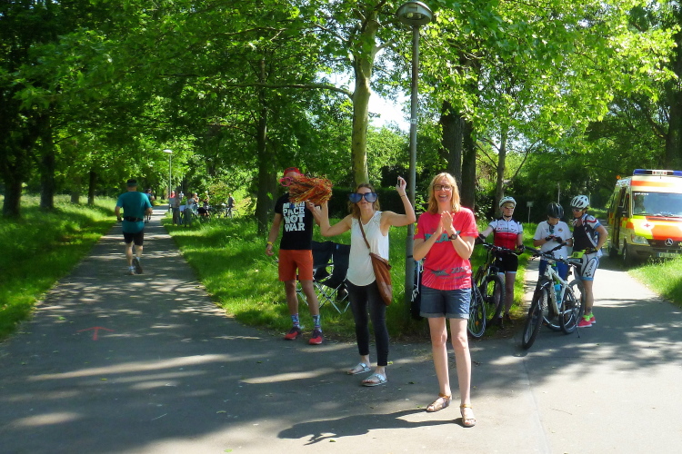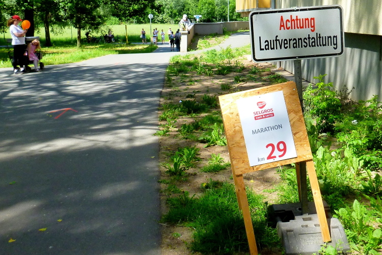Noch vor der Eisenbahnbrücke kann ich auf den letzten Läufer des Dreiviertelmarathons auflaufen. Richard ist am Kämpfen, aber optimistisch. Er wird es schaffen. Dann sehe ich an der Grünen Halle unser Engerl Susanne Singer, sie sammelt wieder Spenden für den Laufclub 21. Rolf Keßler, der barfüßige Clown, muss sein Schuhwerk richten. Noch sechs Kilometer.