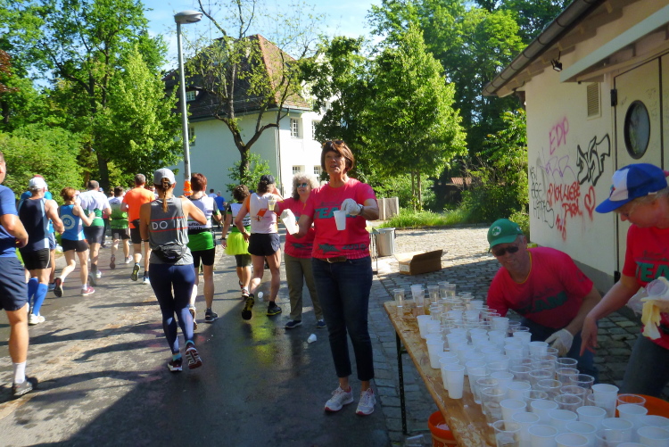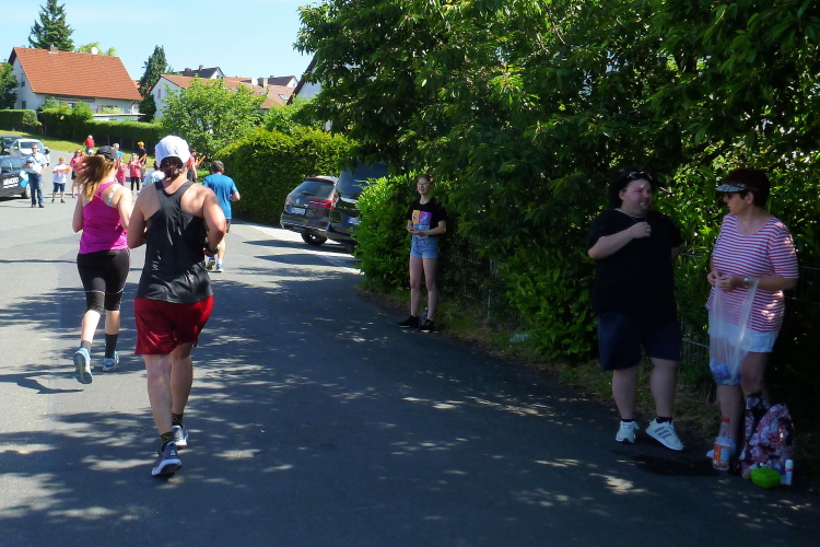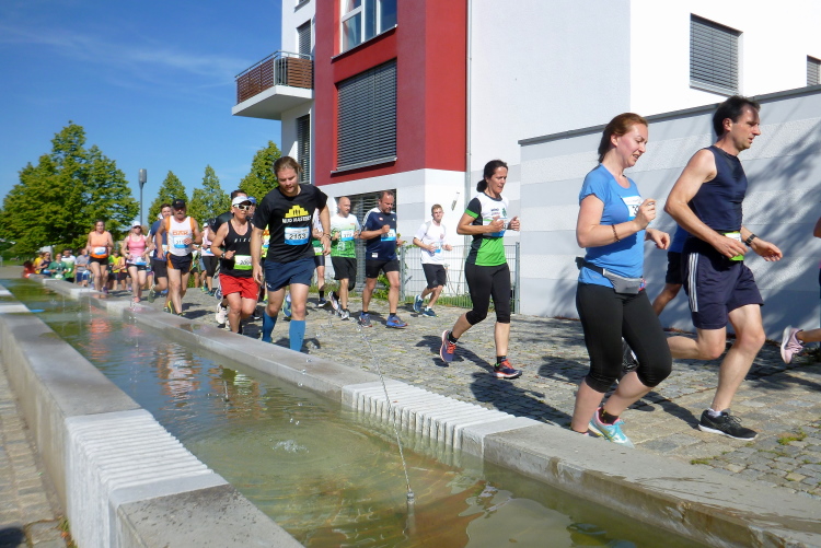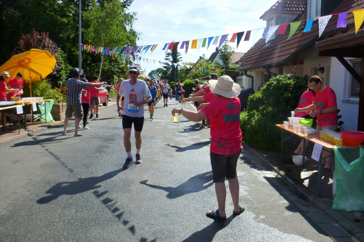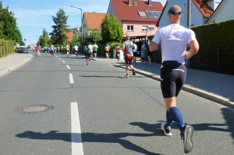 Nach dem erneuten Überqueren des RMD-Kanals auf dem Fürberger Steg können wir uns in Unterfürberg erfrischen. Auch hier Cola, Iso, Obst und Gel und Wasser zur äußeren Anwendung. Ein Wort zur Streckenführung: Dir wir nicht langweilig, denn lange Geraden gibt es nicht. Stattdessen viele Ecken, leichte Anstiege, bebautes Gebiet, dann wieder durch Felder. Bestzeiten können natürlich auf so einem Kurs kaum gelaufen werden. Doch um das geht es den meisten nicht. Der Genuss und das Erlebnis stehen im Vordergrund.