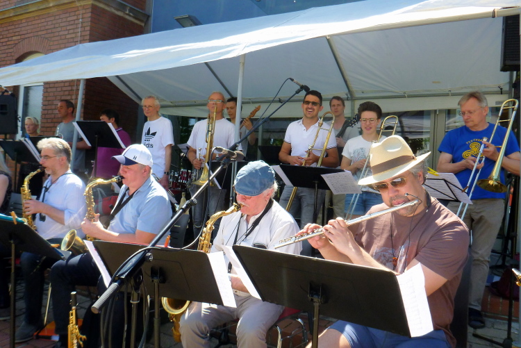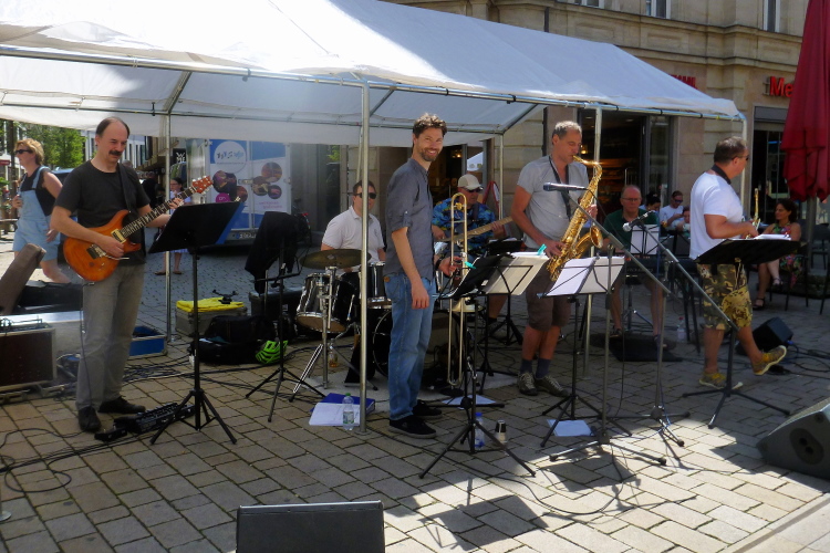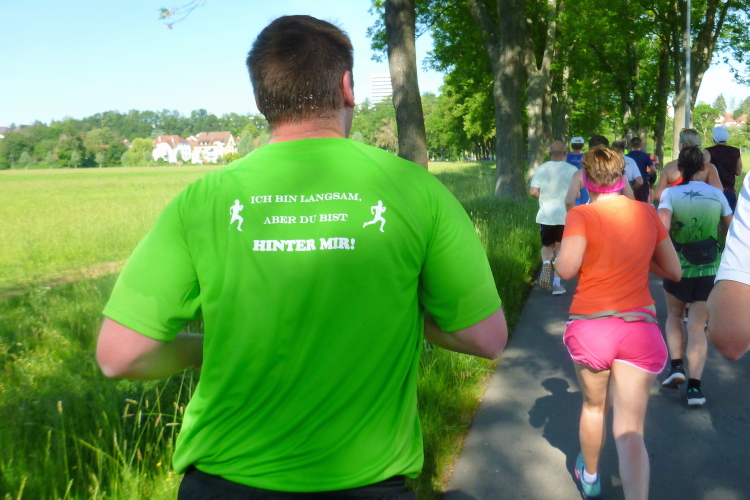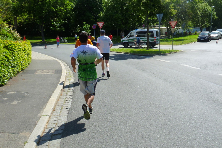 Wir laufen an der Grünen Halle vorbei, quer über den Südstadtpark und an der Musikschule Fürth vorbei. Dort werden wir mit Dixie- und Swingmelodien angefeuert. Die Musiker stehen im Schatten und wir laufen in der Sonne, was noch auszuhalten ist. Aber der Schweiß fließt schon in Strömen. Erst drei Kilometer liegen hinter uns, das wird was werden.