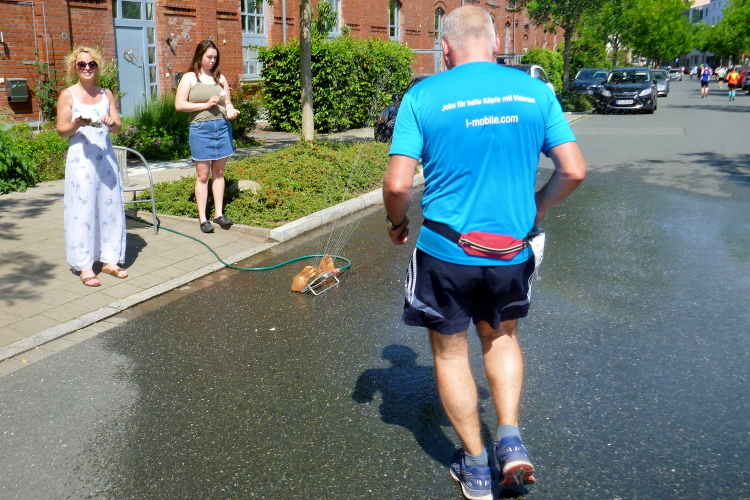 Nach einem kurzen Intermezzo noch im Grünen heißt der nächste Stadtteil Eigenes Heim. Baugenossen haben dem Ort 1909 den Namen gegeben. Ziel war es damals, Einfamilienhäuser zu bauen, die später durch die bauenden Genossen übernommen werden sollten. Viele Anwohner stehen an der Strecke oder am Gartenzaun und geizen nicht mit Beifall. Einige haben sogar Gartenschläuche und Rasensprenger im Einsatz. Die Läufer danken es.