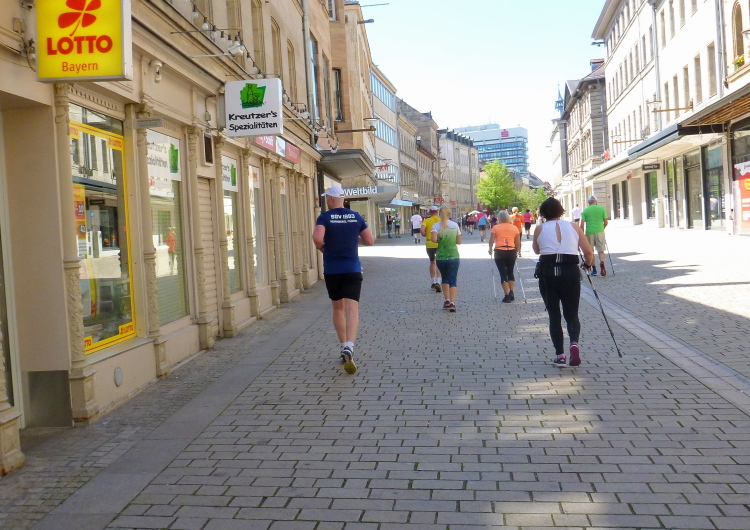 Der 19. Kilometer führt uns zur Uferpromenade an der Rednitz, noch drei Kilometer sind es bis zum Ende der ersten Runde. Dann geht es über die Königstraße in die Innenstadt. Dort haben sich gerade an den Cafés, Wirtschaften und Biergärten viele Zuschauer versammelt. Die Kinder treibt es bei den mittlerweile hohen Temperaturen an die Brunnen, wo sie sich mit Wasser vollspritzen.