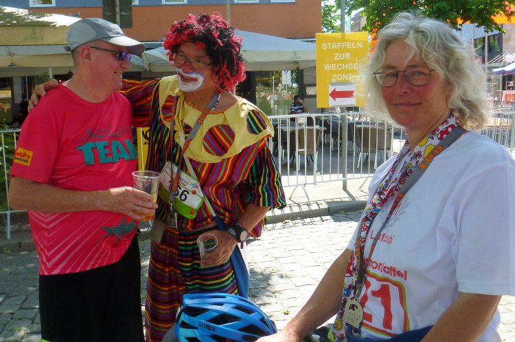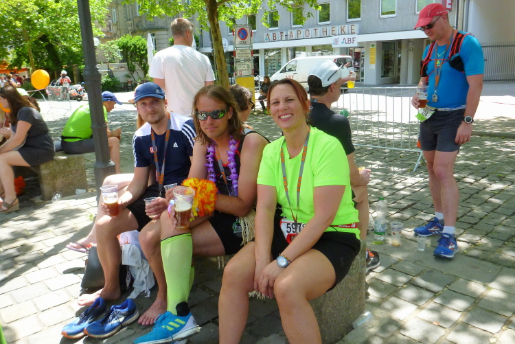 Am Wettkampftag sind wir frühzeitig an der Fürther Freiheit. Es wird heute eine schwere Aufgabe werden, der Wetterfrosch hat einen Sommertag mit Temperaturen bis 30 Grad vorhergesagt. Am Ummeldeschalter sind noch einige Läufer emsig, sie wollen von den längeren Strecken auf eine kürzere ummelden. Das ist gar nicht so verkehrt. Diesen Joker zieht auch meine Henny, sie will nun am Dreiviertelmarathon teilnehmen. Da muss ich den Veranstalter loben, dass eine Ummeldung kostenfrei noch durchgeführt wird. Seitens der Moderation wird dann sogar noch zugesichert, dass Abbrecher noch in eine Wertung eines kürzeren Laufes kommen können. Dann sollte man sich nach dem Zieleinlauf beim Infozelt melden.