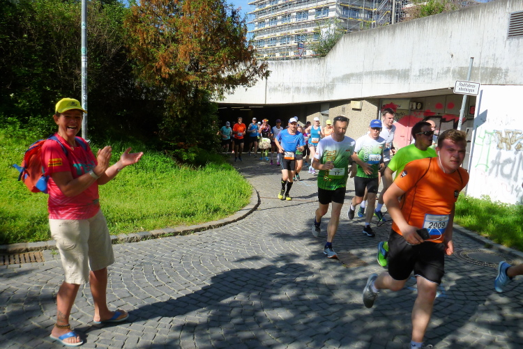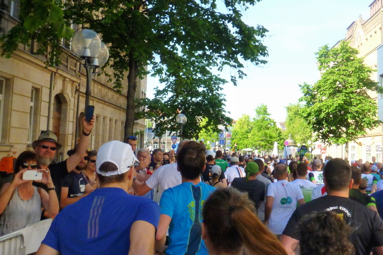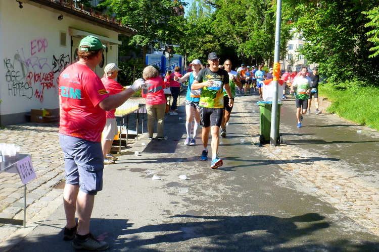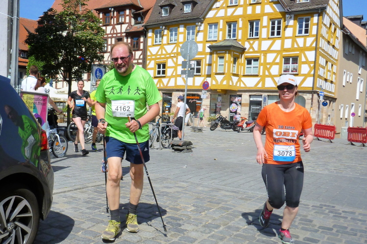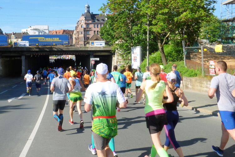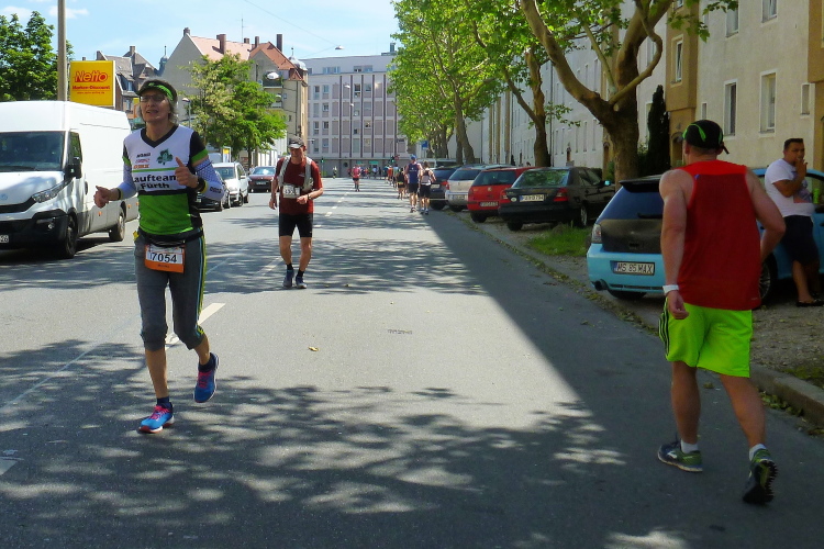 Das Feld ist natürlich übersichtlich geworden, auch wenn die Staffelläufer das Geschäft nun beleben. Aber die kommen von hinten und sind natürlich schneller unterwegs. Dranhängen wäre fatal. Auf dem Rückweg von der Musikschule sehe ich auf der anderen Seite die Pacergruppe um Notger Seitz und Nici Postler, leider haben die nur zwei Mitläufer gefunden. Wir klatschen uns ab und weiter. Die Runde im Pegnitzpark vergeht schnell und schon laufe ich wieder in Richtung Altstadt. Trotz zunehmender Hitze glaube ich, nicht langsamer zu werden. Vielleicht weil ich an jeder Tankstelle trinke und m ich mit Wasser kühle. Am Ende der ersten Volkslaufrunde würge ich ein Gel runter, schon wird mir übel. Salzmangel? Fehlt Zucker? Cola an der folgenden Verpflegung hilft mir über den Berg, die Übelkeit vergeht, die Runde endet und die finalen zehn Kilometer beginnen.