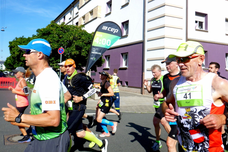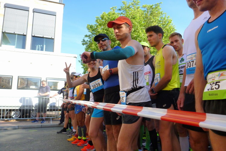 Ein paar Minuten vor dem Count-Down begebe ich mich in den Startblock, die Läufer haben sich schon aufgestellt. Ich habe Mühe, nach vorne zu kommen und noch einige Fotos zu schießen. Matthias Schmitt, der Würzburger, steht schon in der ersten Reihe. Ich weiß nicht, wohin seine Reise geht. Vor 10, 15 Jahren haben wir uns kennengelernt und immer wieder getroffen. Seinerzeit ist er oft unter drei Stunden gelaufen. Er winkt ab und meint: „Wir werden älter und langsamer, doch den Spaß lassen wir uns deswegen nicht verderben.“