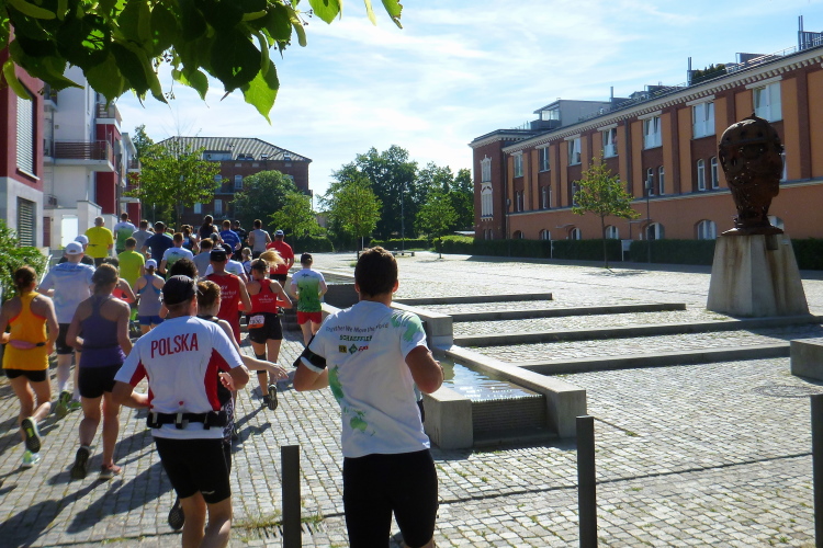 Wir wechseln nun in den Südteil der Stadt, die insgesamt gut 120.000 Einwohner zählt. Schon 1007 wurde die Ansiedelung in einer Schenkungsurkunde genannt. Heute bildet Fürth zusammen mit Erlangen, Nürnberg und Schwabach zusammen mit dem Umland die Metropolregion Nürnberg. Und wenn wir zur obigen Zahl 1007 die Zahl 1000 addieren, dann klingelt es vielleicht. Ja, zur Jahrtausendfeier von Färddh, so sagen die Einheimischen zu ihrer Stadt, gab es einen Jubiläumsmarathon. Einige Shirts, die damals ausgegeben wurden, sehe ich heute im Startfeld.