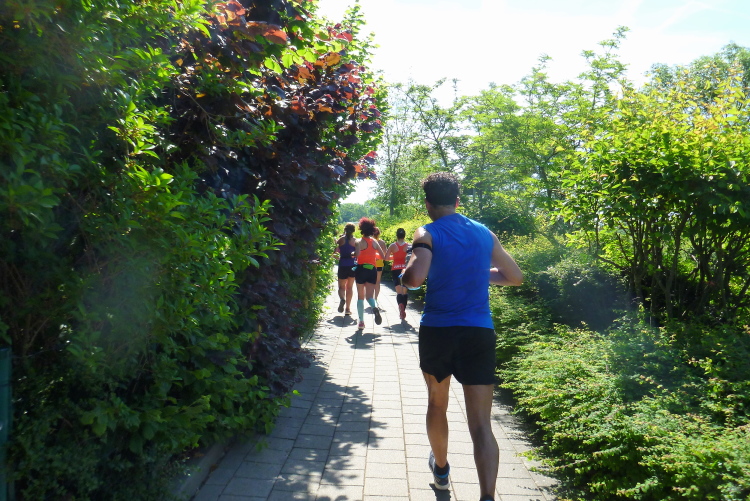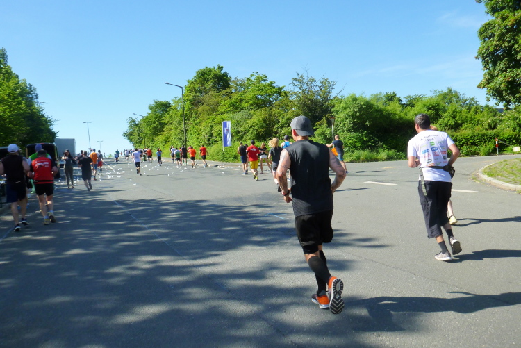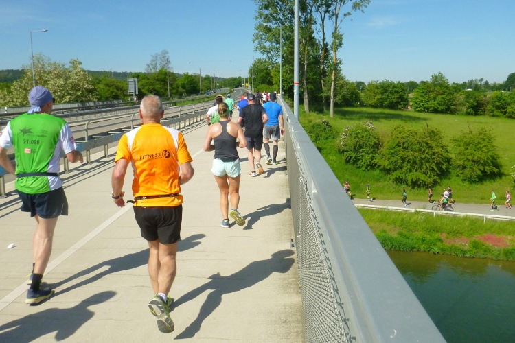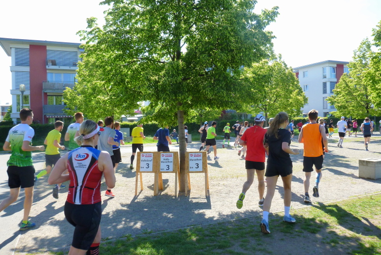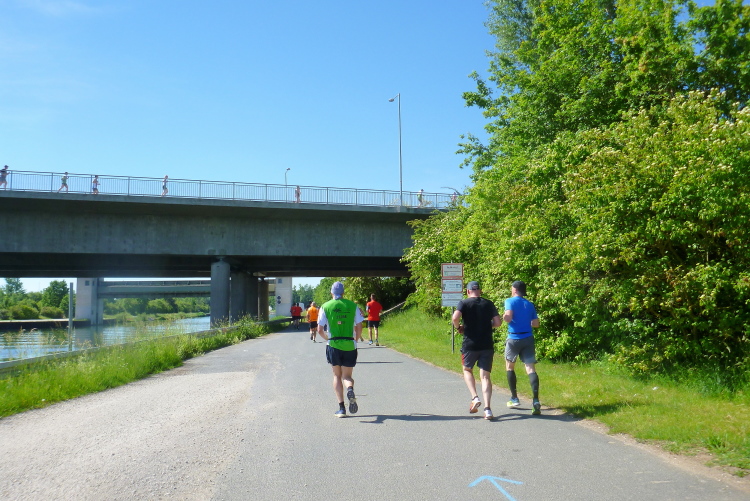 Kurz tangieren wir Oberfürberg und dann am Ortsausgang holen wir uns in einer Wendepunktschleife den fehlenden Kilometer. Denn nach der Halbmarathonrunde sind wir ja schon bei Kilometer 22. Die Schleife führt bis zur Graf-Stauffenberg-Brücke voll in der Sonne. Dann rennen wir auf dem parallelen Radweg, nunmehr im Schatten, zurück. Ich sehe durch die Bäume den 4.15 Stunden-Pacer, rund 200 bis 300 Meter zurück.