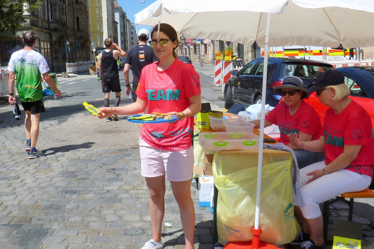 Über den Xylokastroplatz verlassen wir den Park und laufen wieder in Richtung der Eisenbahnunterführung, dann geradeaus zum Engelhardtsteg und über die Pegnitz hinweg. Ein wenig führt uns nun die Strecke durch die Pegnitzwiesen, die etwas Schatten bieten. Die nächste Tankstelle wird von der DLRG Wasserrettung betrieben. Die rot gekleideten Buschen und Madln haben schwer zu tun, um uns mit dem nötigen Aqua zu versorgen. Früh muss ich anfangen, mir das Ha-Zwei-O über die Birne zu schütten.