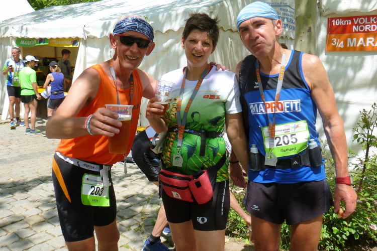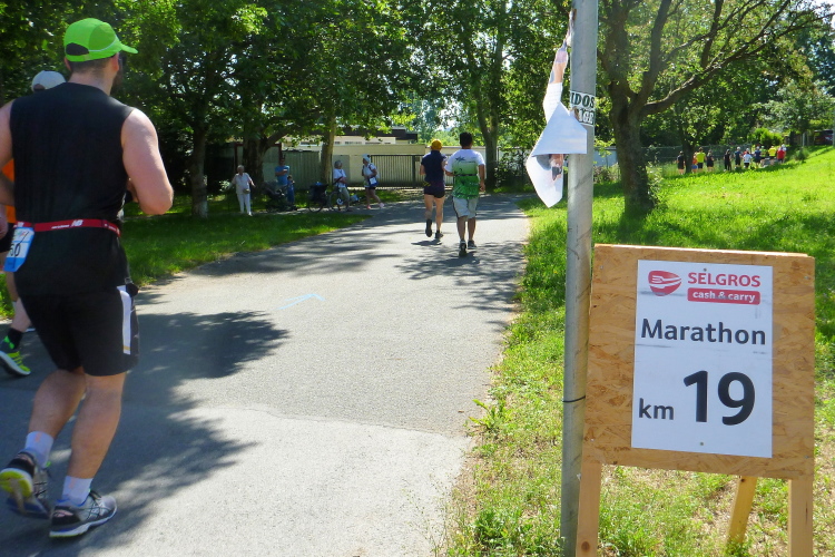 Pfadfinder weisen uns kurz vor dem Ziel den Weg: Marathonis und Dreiviertelmarathonis rechts, die Halbmarathonis dürfen links ins Ziel. Ich fühle mich gut, so dass ich an eine Abkürzung auf die Halbdistanz überhaupt nicht denke. Ich werde noch von der Moderatorin angekündigt und verpflege dann ein paar Meter weiter. Schade, dass es hier bei der Halbzeit kein Bier gibt. Das nächste Mal muss ich mir das von den Finishern des Halben reichen lassen.