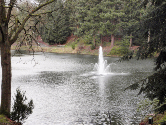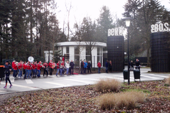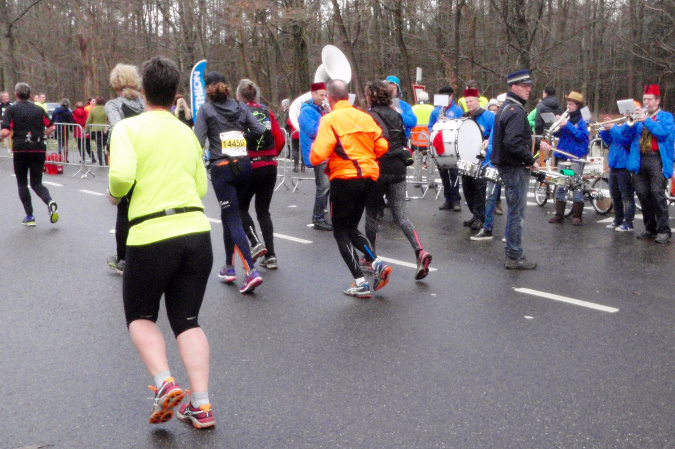 Die Laufstrecke ist abwechslungsreich: Es geht durch ein Parkgelände mit zahlreichen Rhododendron-Sträuchern und oberhalb eines Springbrunnens an einem See vorbei, an dessen gegenüberliegendem Ufer ich den vorderen Teil der Läuferschlange kurz zwischen den Bäumen sehe. An einem Tor mit der Aufschrift „Berg & Bos“ (Berg und Tal) spielt die nächste Musikkapelle: Die Stimmung ist gut. Und ich laufe. Laufe immer noch.