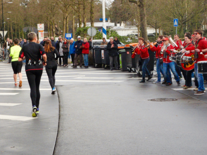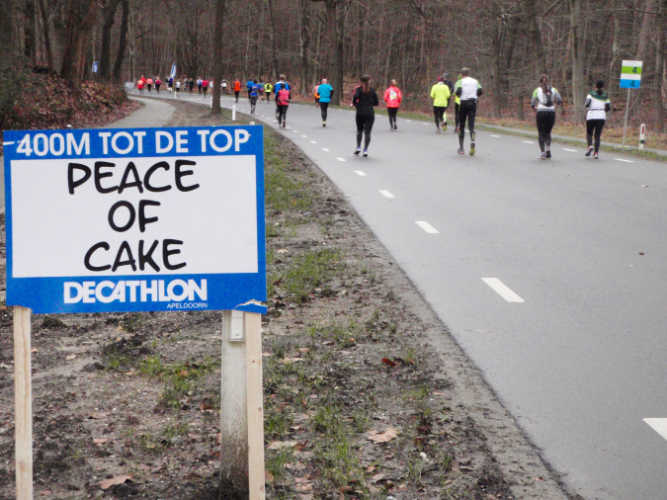 Bei Kilometer vier folgt ein längerer Aufstieg und ein Sponsor verspricht auf großen Tafeln „400 m tot de top“ – was ich aber irgendwie missverstehe: Denn auch hinter dem „top“ – wo uns die 16-Kilometer-Läufer entgegenkommen – geht es noch weiter bergauf. Immerhin erkenne ich an dieser Kreuzung die Laufstrecken wieder, die ich 2011 – damals den noch angebotenen Marathon – und 2012 mit der alten Asselronde gelaufen bin: Mit der neuen Asselronde passiert man diese Kreuzung auf dem Rückweg nicht mehr und muss nicht mehr das anschließende Stadtviertel durchqueren, weil man jetzt auf einer direkten Straßenverbindung die breite Loolaan als Zielgerade erreicht.