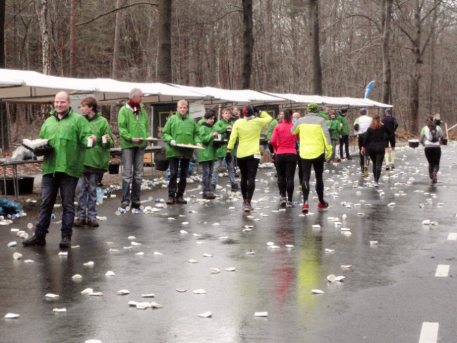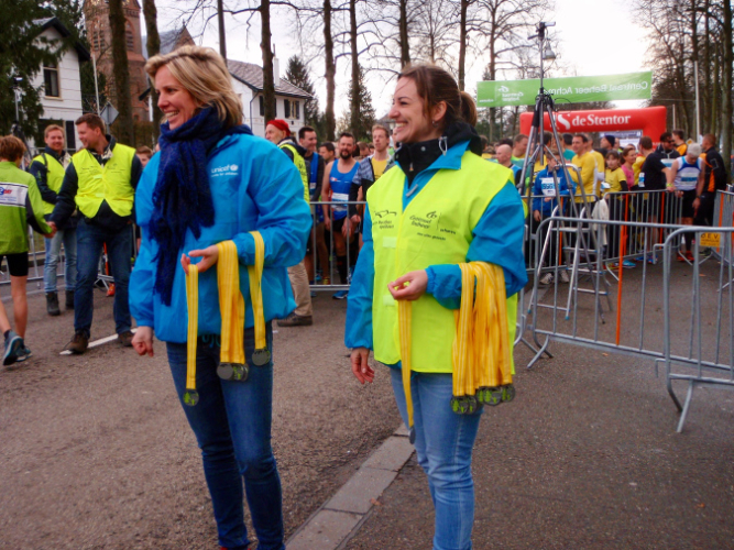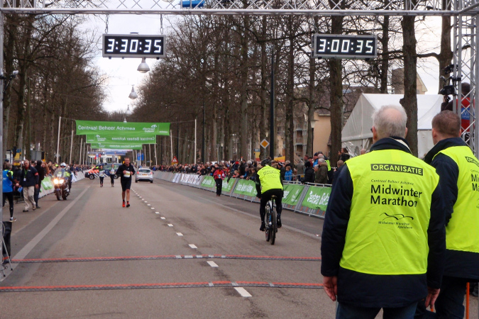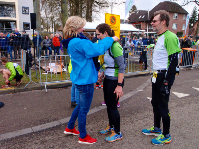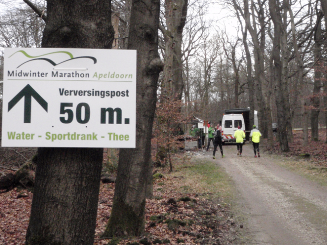 Derweil bekomme ich meine schöne Medaille, bin zufrieden, den Lauf heute in Angriff genommen und tatsächlich durchgestanden zu haben. Überrascht stelle ich fest, dass meine zeitweisen Begleiter bisher nicht zu sehen sind und verziehe mich deshalb zu den Umkleideräumen, denn es geht ein unangenehm kalter Wind. Und der verhindert dann auch, dass ich mich noch lange auf der Loolaan und in Apeldoorn aufhalte: Mir ist kalt – „Midwinter“ halt. Auch wenn der richtige Marathon fehlt: Mir reichen die 25 Kilometer heute.