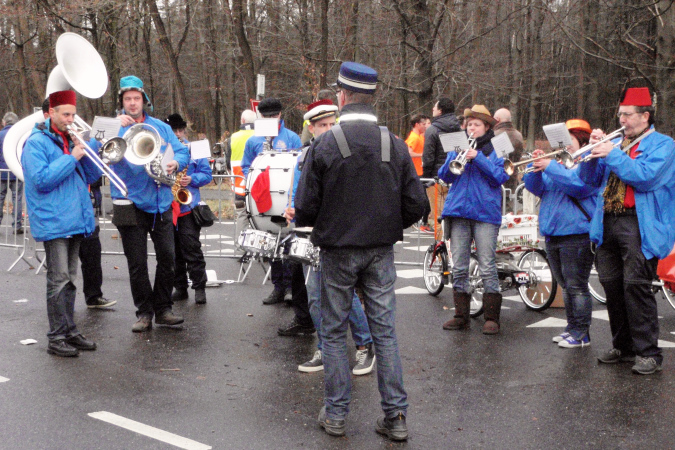 Der Startschuss fällt, es herrscht gute Laune, und schon geht es los. Ich lasse mich mittreiben, bis mir eine Mittelinsel Gelegenheit zu ersten Fotos gibt. Kurz dahinter steht bereits die zweite Musikkapelle – es werden noch einige sein, bis wir das nähere Stadtumfeld verlassen.