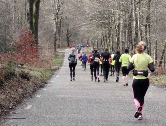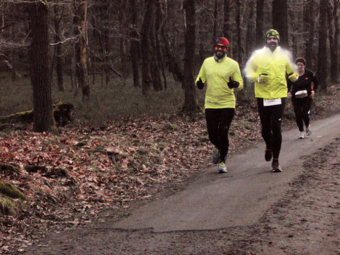 Soweit sind wir aber jetzt, bei Kilometer 6, noch lange nicht: Durch schönen, hochstämmigen Buchenwald geht es weiter auf einer schmalen Straße mit einigem Auf und Ab. Hier höre ich plötzlich deutsche Worte – bisher war mir noch kein deutscher Läufer aufgefallen -, und ich komme daraufhin mit Christian und seinem Begleiter Frank ins Gespräch: Sie sind aus Solingen und Langenfeld angereist, um hier einen langen Trainingslauf in Vorbereitung auf ihren Hamburg-Marathon zu absolvieren. Ihr Tempo ist gemächlich, meines auch – wobei ich immer noch nicht einen heftigen Bedarf zu Gehpausen verspüre. Ein Sanitätsauto will uns passieren, wir laufen auf der engen Straße rechts, aber eine Läuferin zur Linken reagiert nicht: Die Musik in ihrem Kopfhörer ist so laut, dass sie das Auto hinter ihr nicht wahrnimmt, bis ich ihr an ihrem Ärmel ein Zeichen zum Rechtslaufen gebe. Ich selbst mag Laufen mit Musik im Ohr nicht, will lieber den Wind in den Bäumen rauschen hören oder mich wie gerade unterhalten.