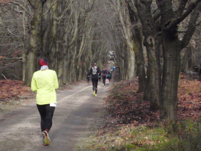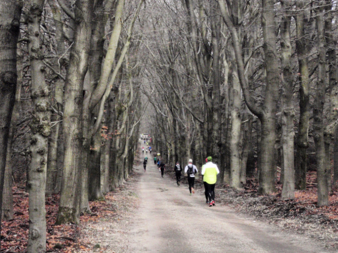 Christian und Frank sind fast noch langsamer unterwegs als ich, so dass ich sie trotz der Fotostopps immer wieder einhole, denn – Überraschung! – ich laufe noch immer. Nicht schnell, aber ohne Schmerzen in der Hüfte. Hinderlich ist nur meine Kraftlosigkeit und eine gewisse Angespanntheit, die aus einem doppelten Sehnenanriss mit Muskelfaserriss drei Jahre zuvor resultiert: Ich traue mich nicht das Risiko einzugehen und einfach mal zu beschleunigen. Doch was soll es: Ich laufe inzwischen schon 14 Kilometer, durch einen wieder interessanteren Wald, dann durch eine schöne Allee, auf der auch eine weitere Läuferin ihr Smartphone zückt, weil sie den schönen Anblick ebenfalls festhalten will.