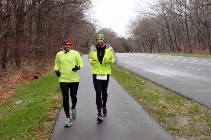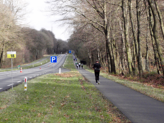 Es zieht sich, und gern würde ich hier mit mehr Kraft ordentlich beschleunigen: Christian und Frank sind immer mehr zurückgeblieben und ich habe inzwischen beschlossen, heute doch keine Gehpausen einzulegen. Übersieht man mal die 200 Höhenmeter der Asselronde, so wäre sie eigentlich eine ideale Strecke, um seine 25-km-Bestzeit anzugreifen: Hier gibt es nicht wie bei einem Citylauf plötzliche Kurven, die ein gleichmäßig schnelles Laufen stören, und auch der Streckenbelag passt. Tatsächlich läuft derweilen der Schnellste, der Belgier Kjell Dehondt, eine Zeit von 1:21 Stunden, nur 10 Minuten langsamer als der aktuelle Weltrekord.