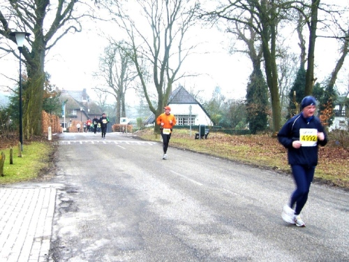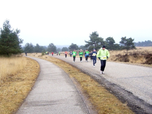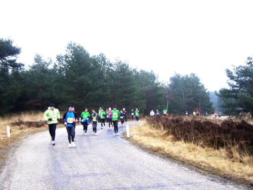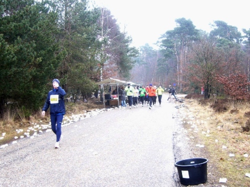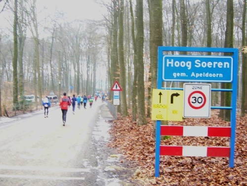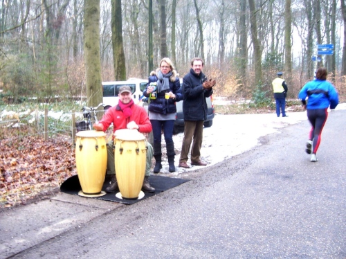 Hier beginnt auch das größte Waldgebiet der Niederlande, die Veluwe. Der Nationalpark ist der zweitälteste der Niederlande. Es geht Richtung Hoog Soeren weiter über den Soerenseweg. Am Abzweig für die 2. Runde in den Kampsteeg bei ca. Km 9,5 sitzt ein Trommler mit drei großen Congas am Wegesrand und motiviert die vorbeilaufenden Läufer. Ein Wunder, dass er nicht eingefroren ist. Letztes Jahr war er auch schon hier.