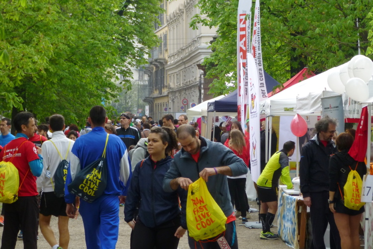 Vorgenanntes Motto gilt ohne Zweifel auch für Start und Ziel. Denn hierfür wird einer der Prachtboulevards Mailands gesperrt: der Corso Venezia. Bevor man sich in den zugewiesenen Startblock zu Füßen der herrschaftlichen Palazzi entlang des Corso einreihen darf, muss man jedoch erst einmal eine Art Rundlauf durch das Gelände um das altehrwürdige Museo Civico di Storia Naturale (Naturkundemuseum) am Rande der Giardini Montanelli bewältigen. Im Gewusel Tausender Läufer bin ich im ersten Moment reichlich orientierungslos. Aber das Chaos ist wohlorganisiert. Durch mit Gittern abgesperrte Bereiche und Wege wird man fast schon Ikea-mäßig via Charity-Zeltdorf, Massage- und Umkleidezelte, Dixie-Kolonnen und Gepäckabgabestelle unweigerlich zu den streng überwachten „Corrals“ auf dem Corso gelotst.