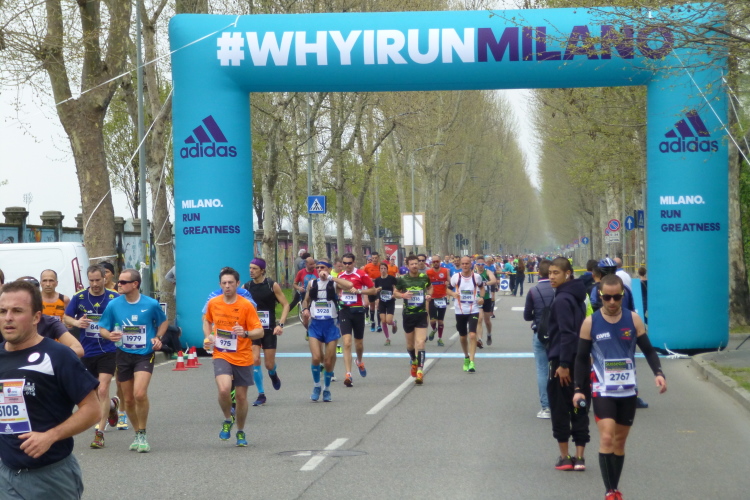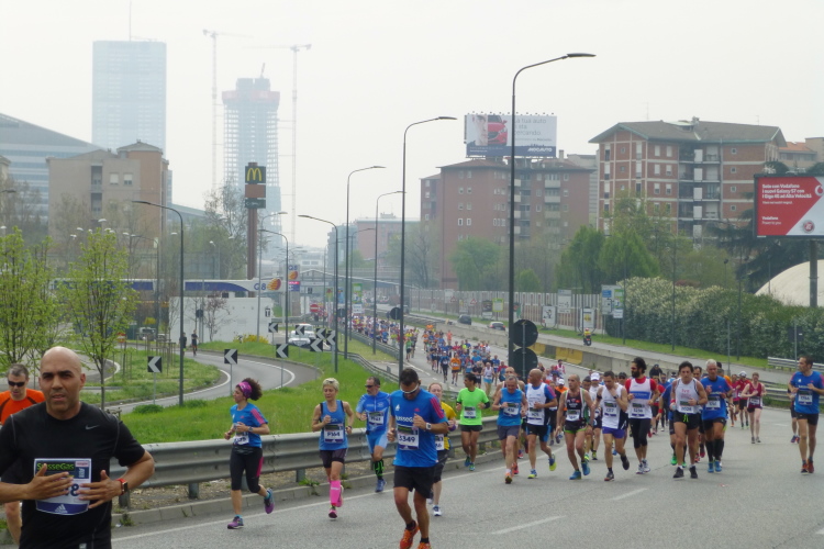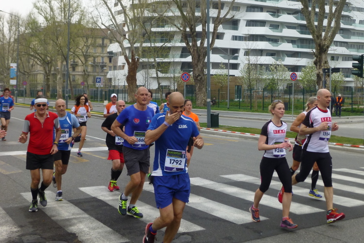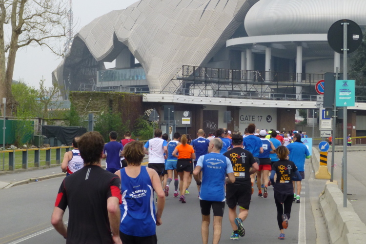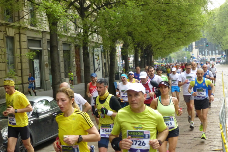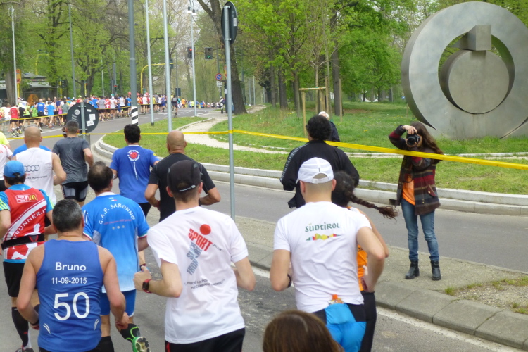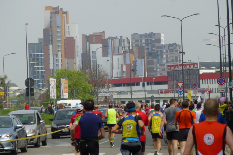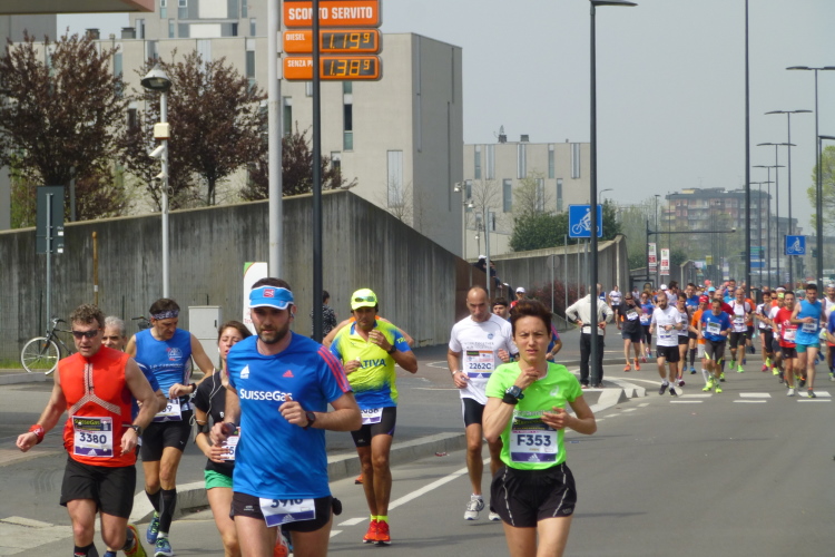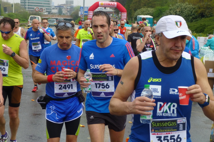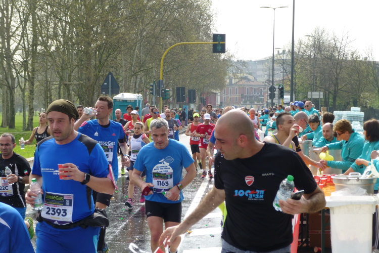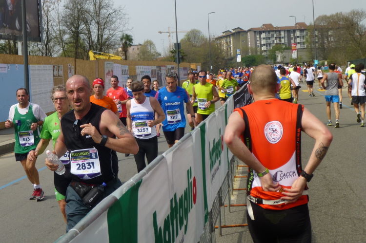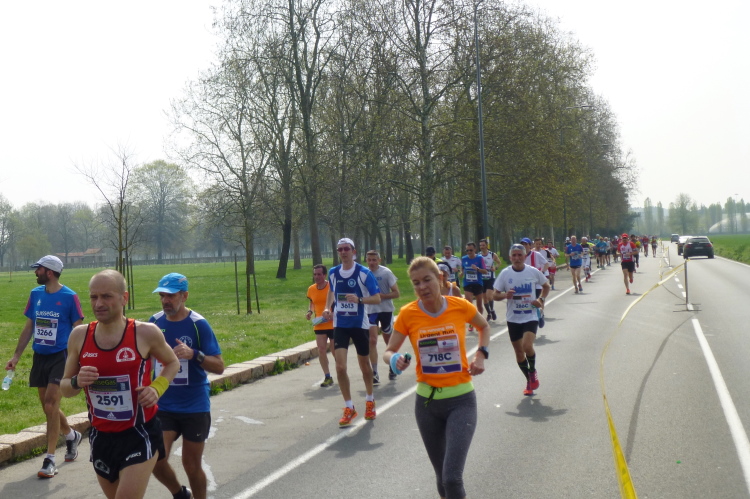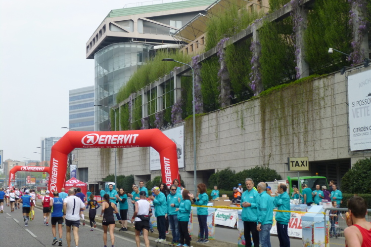 Noch einsamer und naturnaher wird es wenig später: Zur Rechten passieren wir jenseits des km 24 den zur Straße hin offenen, weitläufigen Parco di Trenno, zur linken „wilde“ Wiesen, Wald und Felder. Doch der Ausflug in die Natur währt nur kurz, schon holt uns die „Zivilisation“, zumeist in Gestalt mehrstöckiger Wohnblöcke, ein. Wirklich spannend ist das nicht, aber da muss man eben durch. Mehr denn je helfen die alle 5 km eingerichteten Verpflegungspunkte, zumal sich die Temperaturen mittlerweile deutlich jenseits der 20 Grad C bewegen. Wasser und Iso-Getränke gehören zum Standard, daneben stehen Bananen-, Apfel- und Orangenstücke im kulinarischen Programm. Das Wasser gibt es, wie in Italien üblich, in der Flasche – verschwenderisch, aber praktisch.