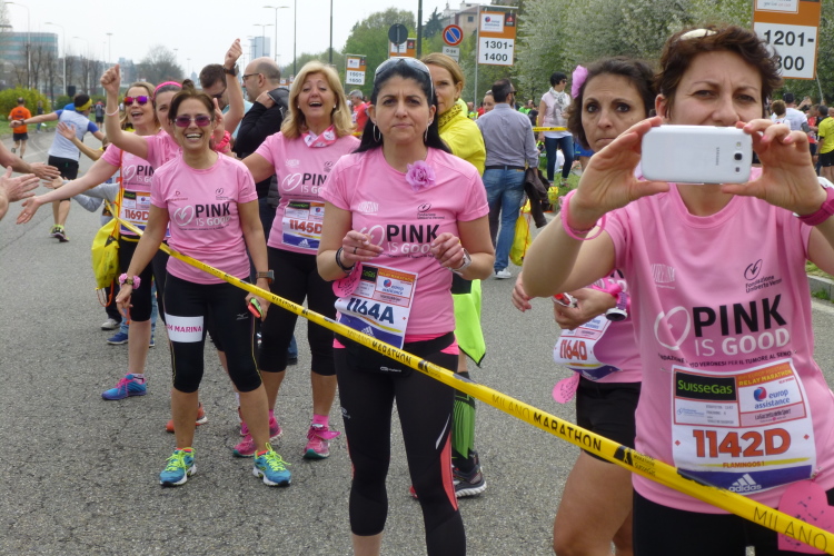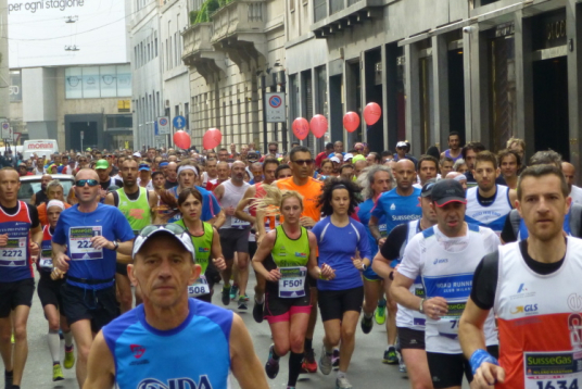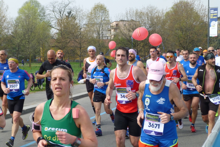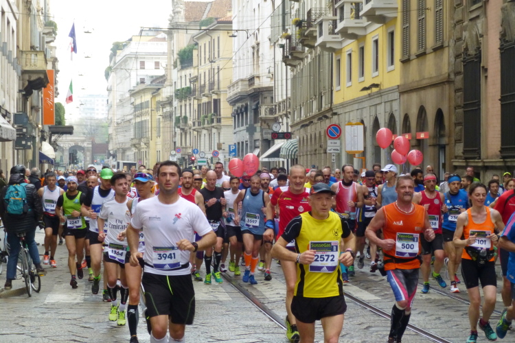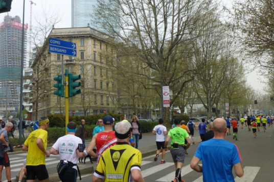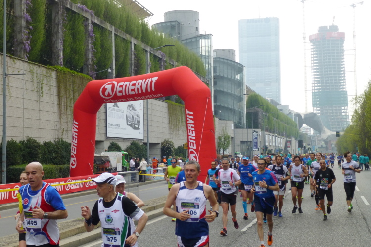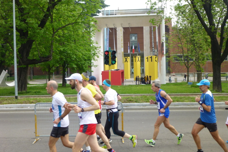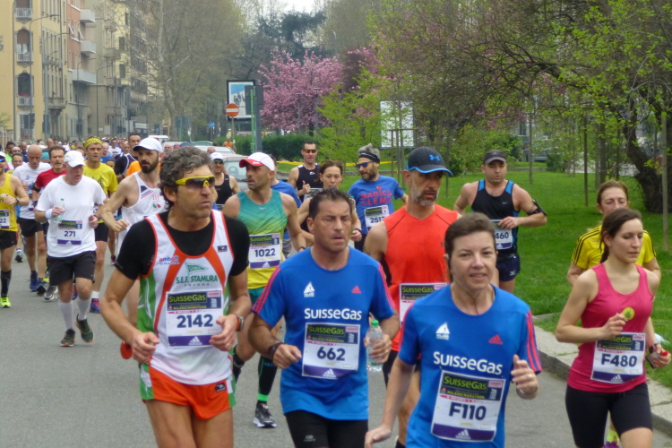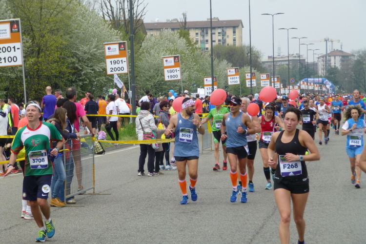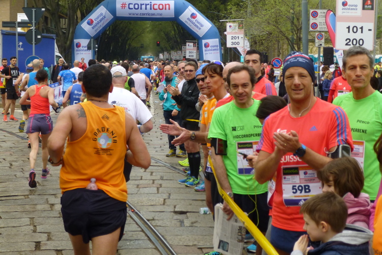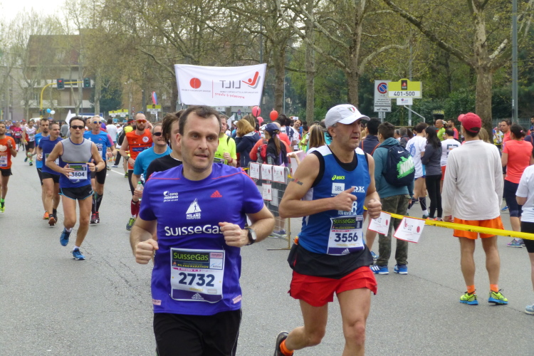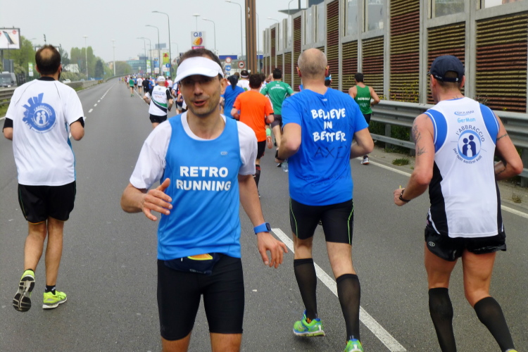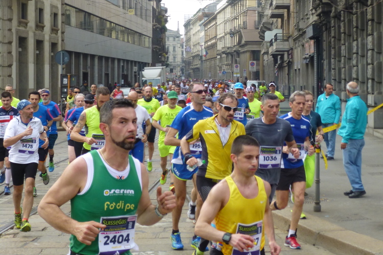 Noch einsamer und naturnaher wird es wenig später: Zur Rechten passieren wir jenseits des km 24 den zur Straße hin offenen, weitläufigen Parco di Trenno, zur linken „wilde“ Wiesen, Wald und Felder. Doch der Ausflug in die Natur währt nur kurz, schon holt uns die „Zivilisation“, zumeist in Gestalt mehrstöckiger Wohnblöcke, ein. Wirklich spannend ist das nicht, aber da muss man eben durch. Mehr denn je helfen die alle 5 km eingerichteten Verpflegungspunkte, zumal sich die Temperaturen mittlerweile deutlich jenseits der 20 Grad C bewegen. Wasser und Iso-Getränke gehören zum Standard, daneben stehen Bananen-, Apfel- und Orangenstücke im kulinarischen Programm. Das Wasser gibt es, wie in Italien üblich, in der Flasche – verschwenderisch, aber praktisch.