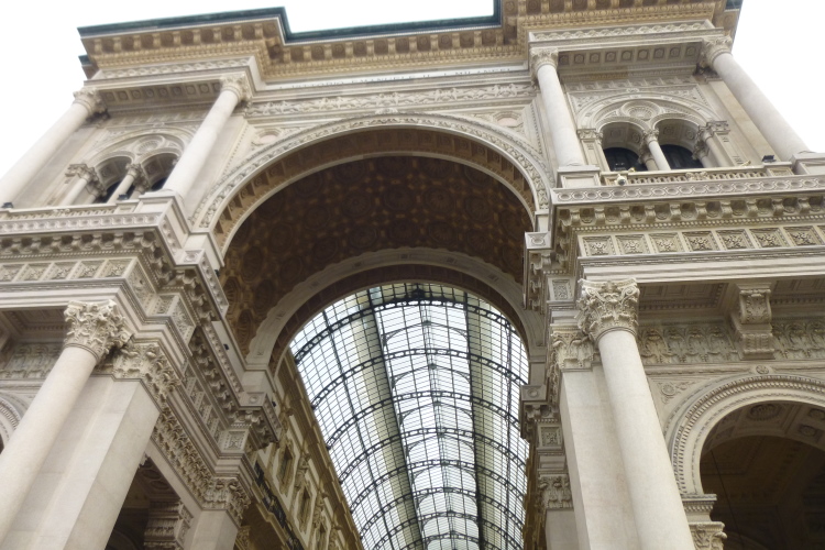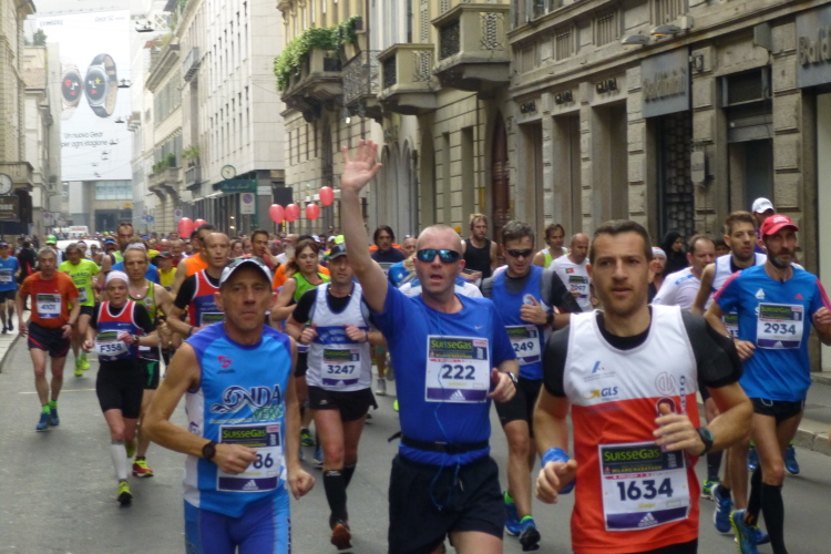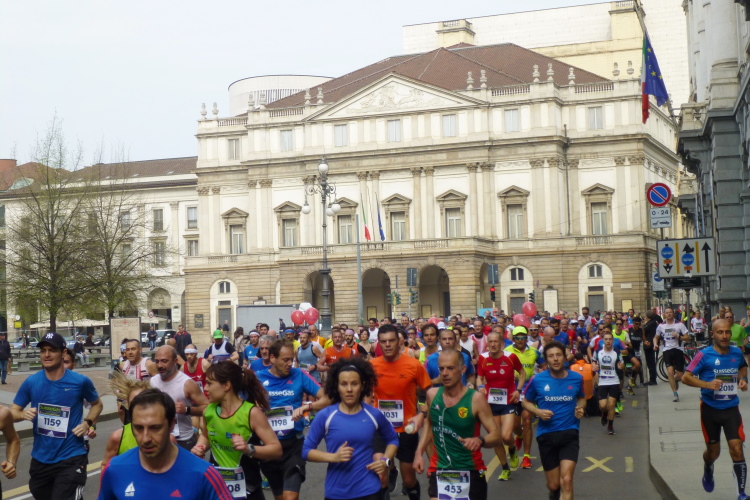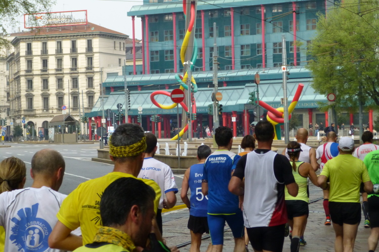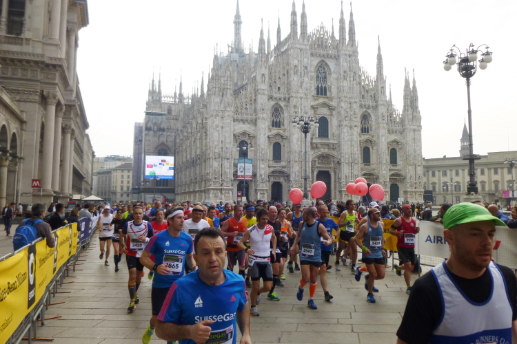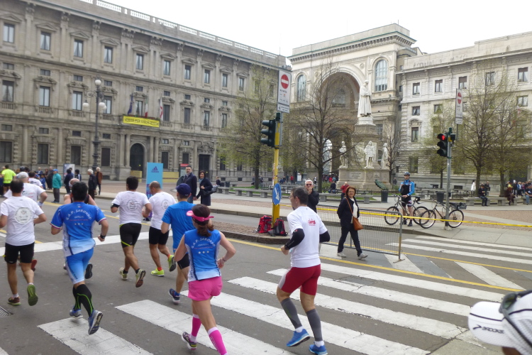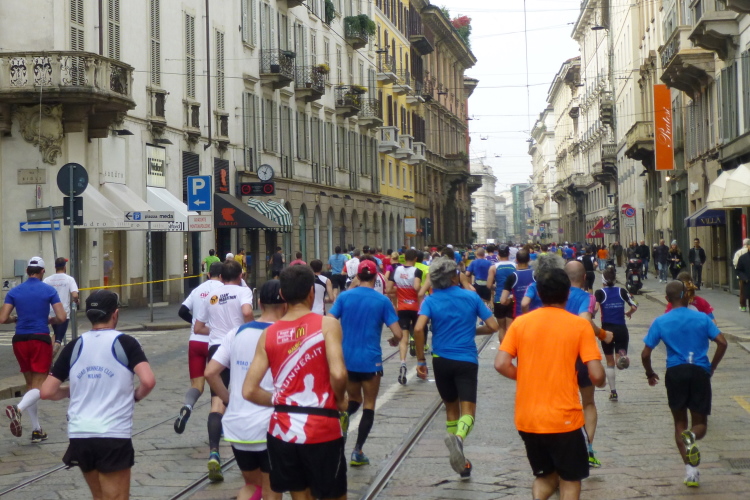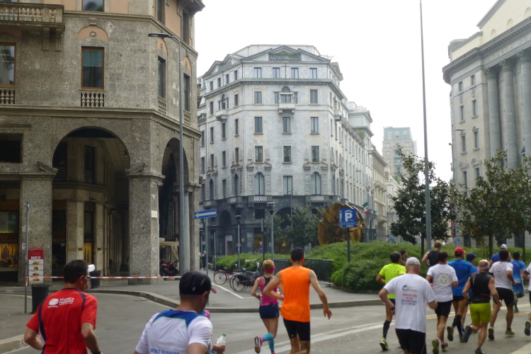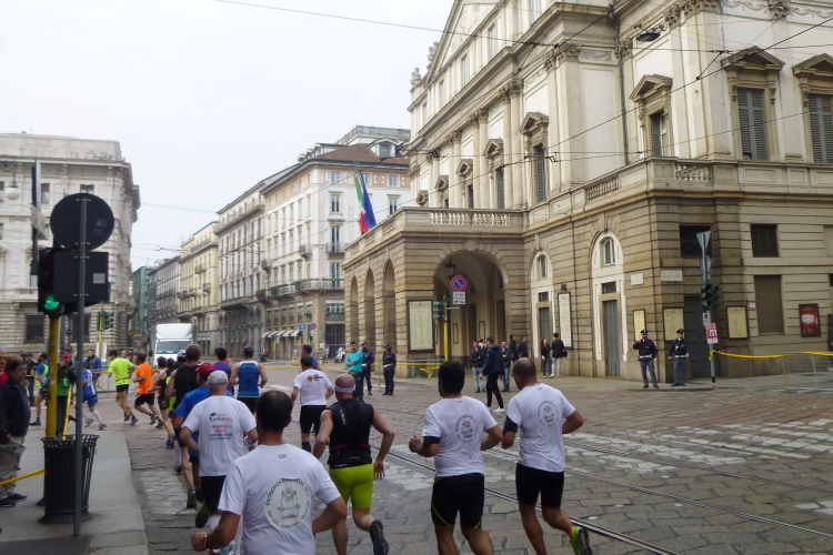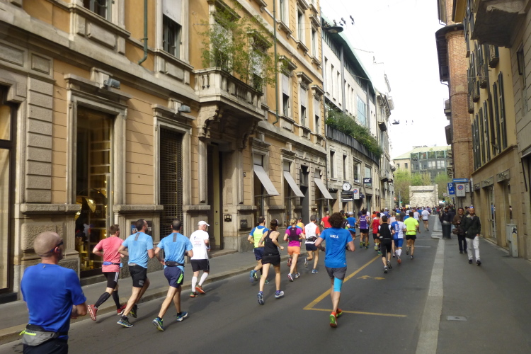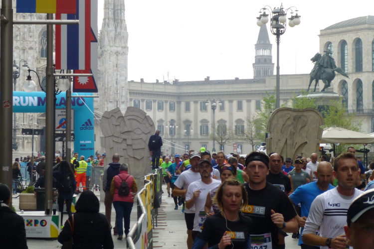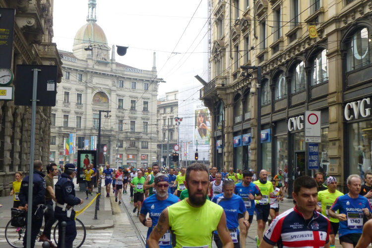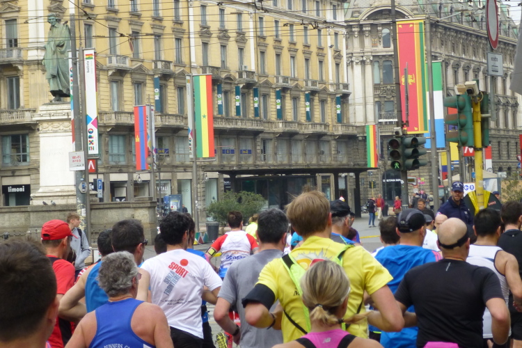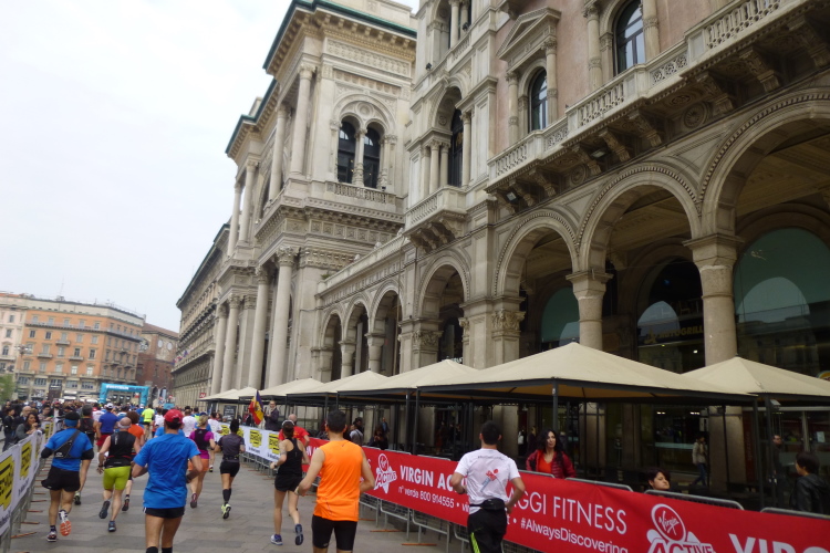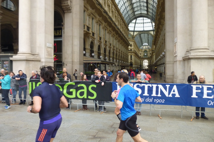 Zur Rechten können wir vom Domplatz aus im Vorbeilaufen eine Sekundenimpression der Galleria Vittorio Emanuele II erhaschen. Durch einen Triumphbogen gelangt man von hier hinein in die älteste, berühmteste und opulenteste Shoppingarkade auf dem Globus. Vom Domplatz führt sie direkt zur Piazza della Scala. Ich denke mir nur: Wäre das nicht eine irre Sache, den Marathon da durch zu leiten. Nun ja, wohl ein wenig zu verwegen, dieser Gedanke ….