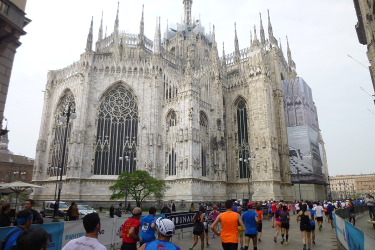 Erst spitzt sie nur ein wenig durch die Häuserschlucht durch, dann immer mächtiger und gewaltiger, „die“ Attraktion Mailands: Il Duomo. Im 14. Jahrhundert wurde hier im gotischen Zuckerbäckerstil eine der weltweit größten und prächtigsten Kirchen erschaffen. Und selbst, wer mit Kirchlichem nicht viel am Hut hat: Ein Besuch ist ein Muss. Vor allem der des Dachs: Denn der Blick über und durch 3.400 Türmchen, Bögen, Statuen und Skulpturen sowie die Stadt rundum ist einfach atemberaubend. Als Läufer müssen wir allerdings „auf dem Boden der Tatsachen“ bleiben. Und so traben wir ehrfürchtig zunächst im Schatten der Nordfassade entlang.