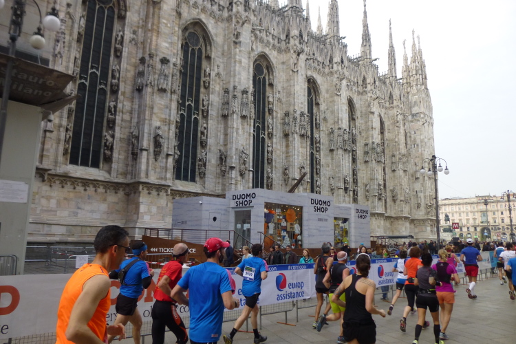 Für uns Läufer eröffnet sich die ganze Pracht des Doms erst, als wir die riesige Piazza del Duomo erreichen und, quasi im „Rückspiegel“, einen Panoramablick auf die berühmte, reich verzierte Vorderfront, die Postkartenseite des Doms, werfen können.