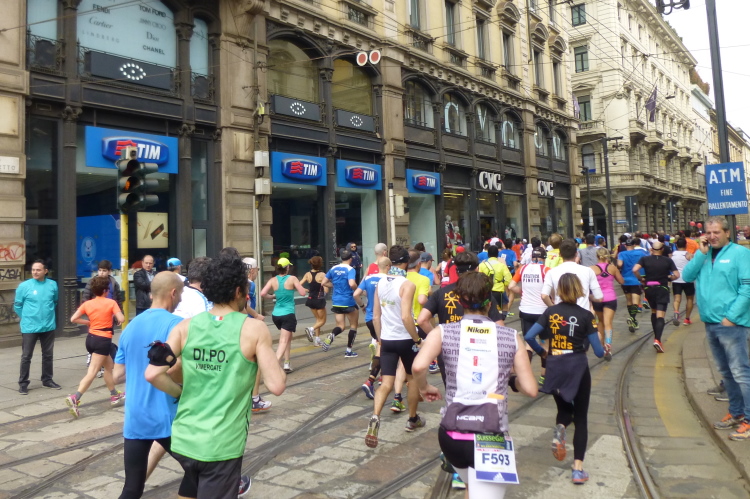 Ein mächtiger Torbogen am anderen Ende der Piazza della Scala zieht den Blick auf sich. Mehr von wem, was sich dahinter verbirgt, bekommen wir keine zwei Minuten später zu sehen. Zunächst dürfen wir im Slalom weitere Altstadtgassen durchkurven. Als wir kurz darauf bei km 7 auf den Corso Vittorio Emanuele einbiegen, haben wir die als Fußgängerzone gestaltete und nach Besucherzahlen zugkräftigste Shopping-Meile Mailands erreicht. Modekettenläden a la H&M, Benetton & Co., wie es sie uniform mittlerweile überall auf der Welt gibt, reihen sich hier dicht an dicht. Doch ist es bestimmt nicht dies, was die Spannung steigen lässt.