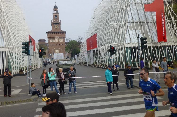 Nach 9 km treten wir hinaus auf den kreisrunden Largo Cairoli, einen ebenso wunderschön gestalteten wie gelegenen Platz am Übergang von Altstadt zum Parco Sempione und dem Castello Sforzesco. Vor allem das zinnengekrönte, mit mächtigen Rundtürmen und Wassergraben befestigte Castello zeigt sich hier von seiner Schokoladenseite. Zu sehen bekommen wir allerdings nur den Torre del Filarete, das Haupttor des Castellos. Und auch nur für Augenblicke eröffnet sich zwischen den den Platz beherrschenden, zeltartig aufragenden Expogates der Triennale ein Blickfenster. Nun ja, 30 km weiter sind wir wieder hier, nur dann auf der anderen Seite der Burg.