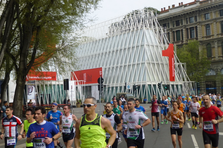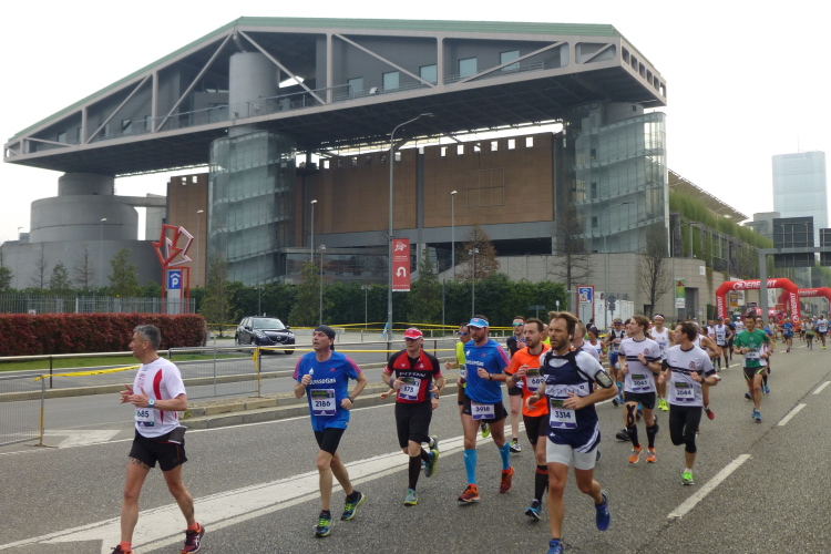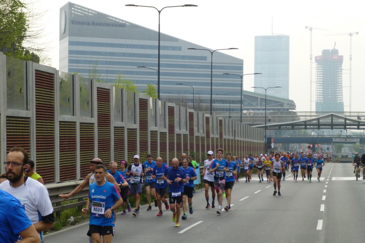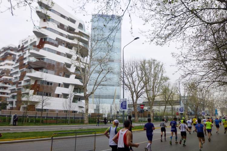 Einen optisch krassen Gegensatz dazu bilden die uniformen, grauen Wohnblöcke, an denen wir kurz darauf vorbei joggen. Das „neue Mailand“ ist hier jedoch noch längst nicht zu Ende. Nach einem Schlenker erreichen wir die schnellstraßenartig ausgebaute Viale L. Scarampo und passieren hier, im Stadtteil Il Portello, die mächtigen, teils begrünten Hallen der neuen Fieramilano City, einmal mehr mit Ausblicken auf weitere steingewordene Architektenfantasien.