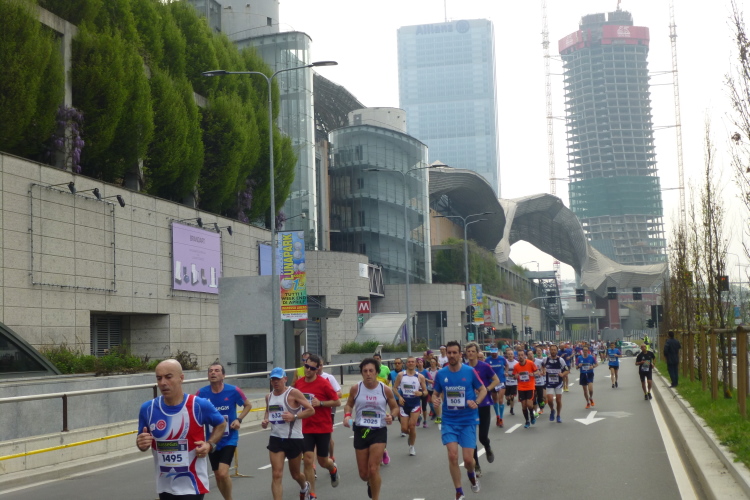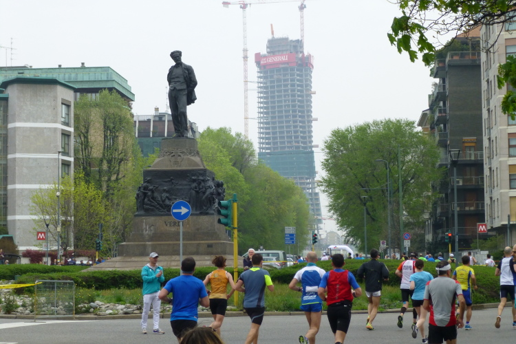Nach 12,5 km erreichen wir den südlichsten Punkt unseres Streckenkurses. Hier macht der Kurs eine Spitzkehre auf die breite Via Giorgio Washington, auf der es bis zum Horizont schnurgeradeaus weitergeht. Im Dunst des fernen Horizonts wird aber schon unser nächster Strecken-Hot-Spot sichtbar: „CityLife“.
