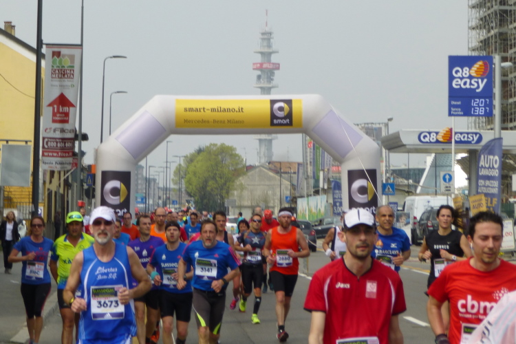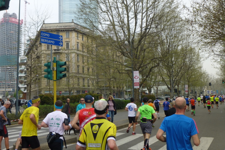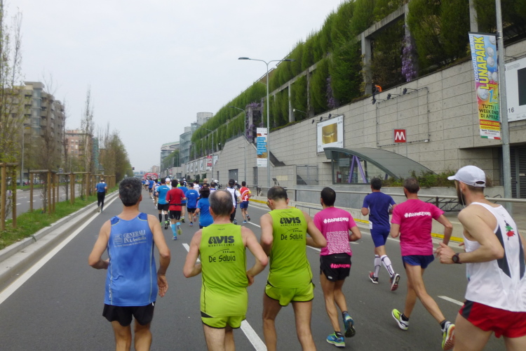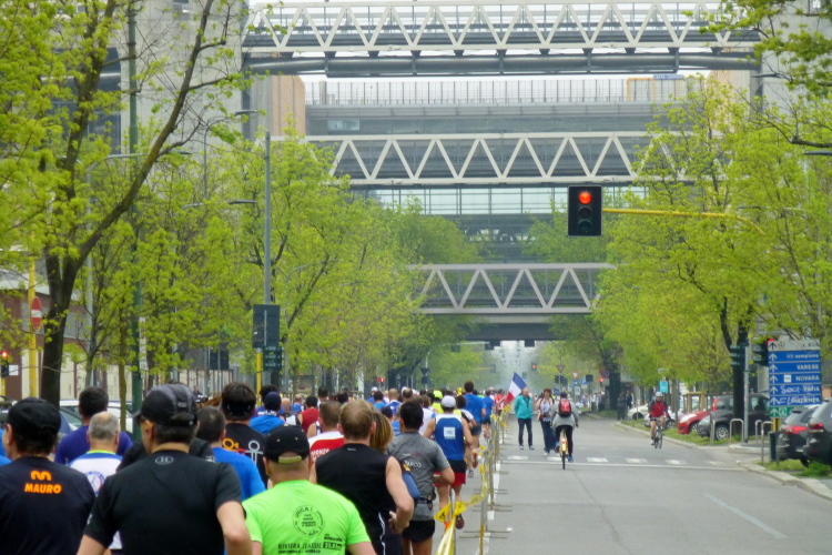 Bei km 29,5 ist der nördlichste, zielfernste und gleichzeitig mit 140 m üNN höchstgelegene Streckenpunkt erreicht. Nun ja: Der tiefstgelegene Punkt liegt bei 118 m üNN, die Strecke ist damit insgesamt extrem flach und schnell, vorausgesetzt man ist physisch in der Lage, diesen Vorteil zu nutzen. Ab diesem Punkt geht es über die Via Gallarate direttissima in Richtung Innenstadt zurück. Auch diese Kilometer durch Gewerbe- und Wohngebiete, teils mit Autoverkehr auf der Gegenspur, zählen nicht unbedingt zu den Highlights der Strecke. Bis etwa km 34 währt die optische Durststrecke.