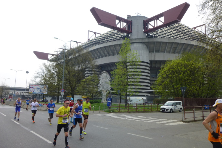 Eine Mailänder Institution der ganz anderen Art rückt bei km 23 ins Blickfeld: Das Stadio San Siro, heute auch Giuseppe-Meazza-Stadion genannt, Heimstätte der beiden legendären Mailänder Fußball-Top-Clubs Inter und AC. Über 80.000 Menschen fasst die monströse, mich an die moderne Version eines Kolosseums erinnernde Betonschüssel. Angesichts der Stille und Leere schwer vorstellbar ist, wie sich hier Menschenmassen in der Größenordnung fast einer Großstadt zur kollektiven Huldigung der Fußballgötter zusammen rotten.