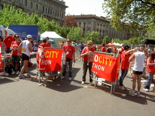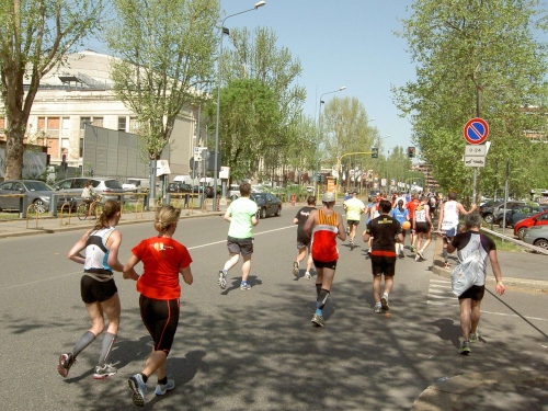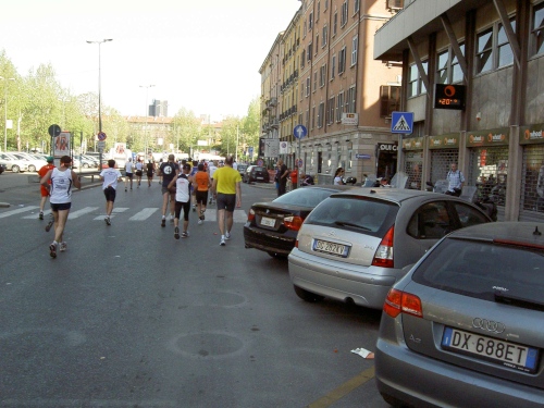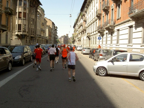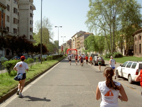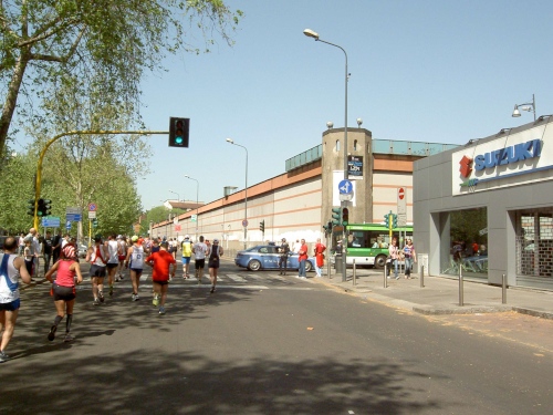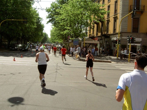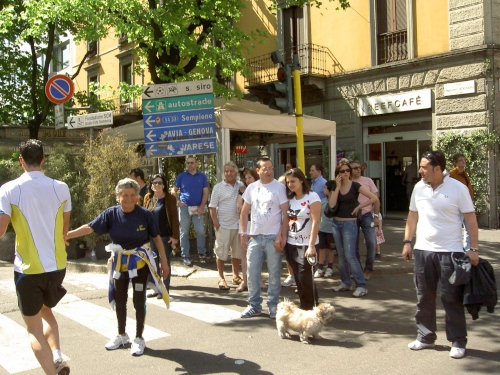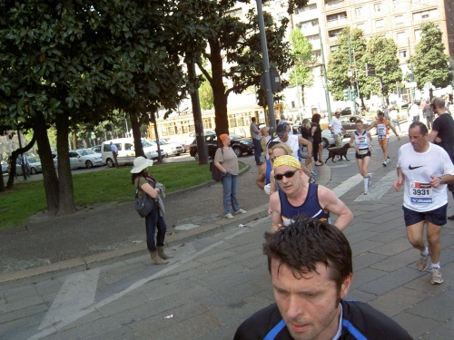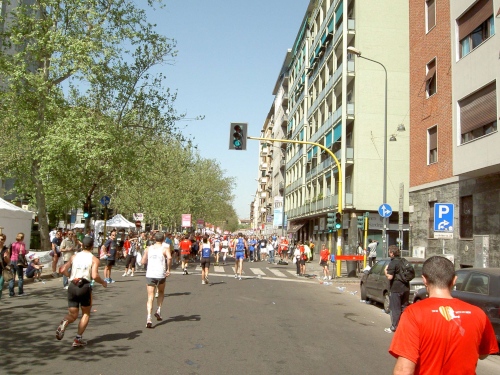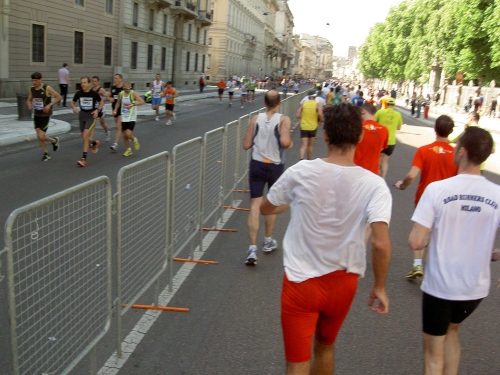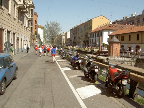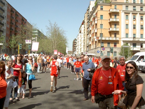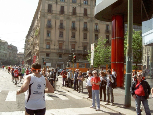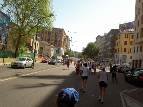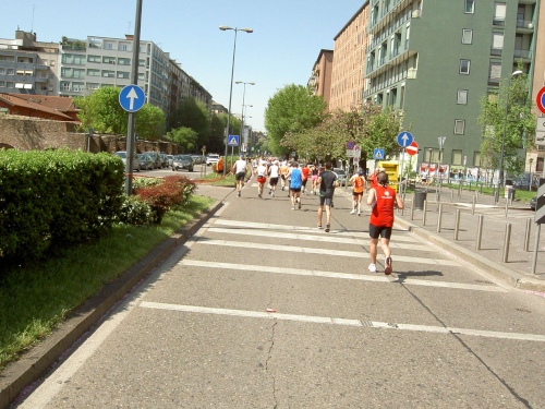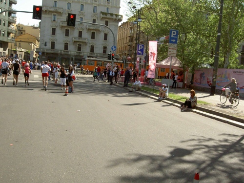 Jetzt beginnt auch ein typisches Mailänder Phänomen: der Unmut der Autofahrer auf den Marathon. Es wird gehupt und mit allen Mitteln versucht, zwischen den Läufern hindurch zu fahren, auch wenn die Polizei dies zu verhindern sucht. Ich hatte gehofft, dass die neue Streckenführung und die vielen Hinweisschilder an der Laufstrecke das etwas mildern, aber der Mailänder braucht halt den Ärger, und in der Zeitung steht am nächsten Tag zu lesen, dass es dieses Jahr schon besser geworden ist...