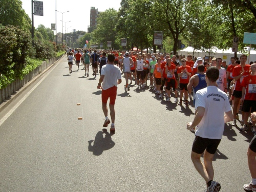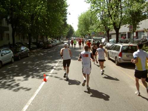 Ich werde das erste Mal auf Deutsch angesprochen, von einem schwarzen Läufer, der mir erzählt, dass er seinen ersten Marathon läuft. Ich rechne ihm vor, dass er jetzt im gleichen Tempo weiter laufen muss, um noch gut unter der Vier-Stunden-Marke zu bleiben. Ich selbst muss jetzt leider etwas langsamer werden und schicke ihn weiter, noch bevor ich fragen kann, wo er so gut Deutsch gelernt hat.